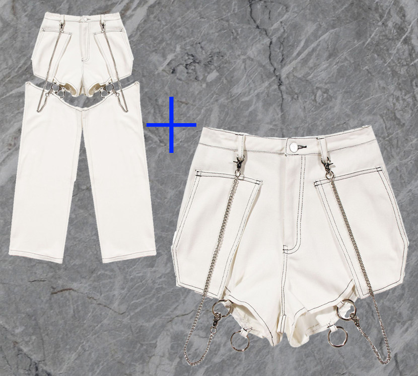 Уличная одежда, женские шорты с металлической застежкой и цепочкой + брюки, съемные, два способа ношения, джинсовые брюки-Капри, сексуальные белые джинсовые брюки, Femme