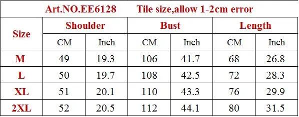 3. Размер: M/L/XL/2XL (Размер Преобразования: 1 см = 0,394 дюйма. Все размеры указаны в азиатских размерах. Пожалуйста, обратитесь к таблице размеров.)