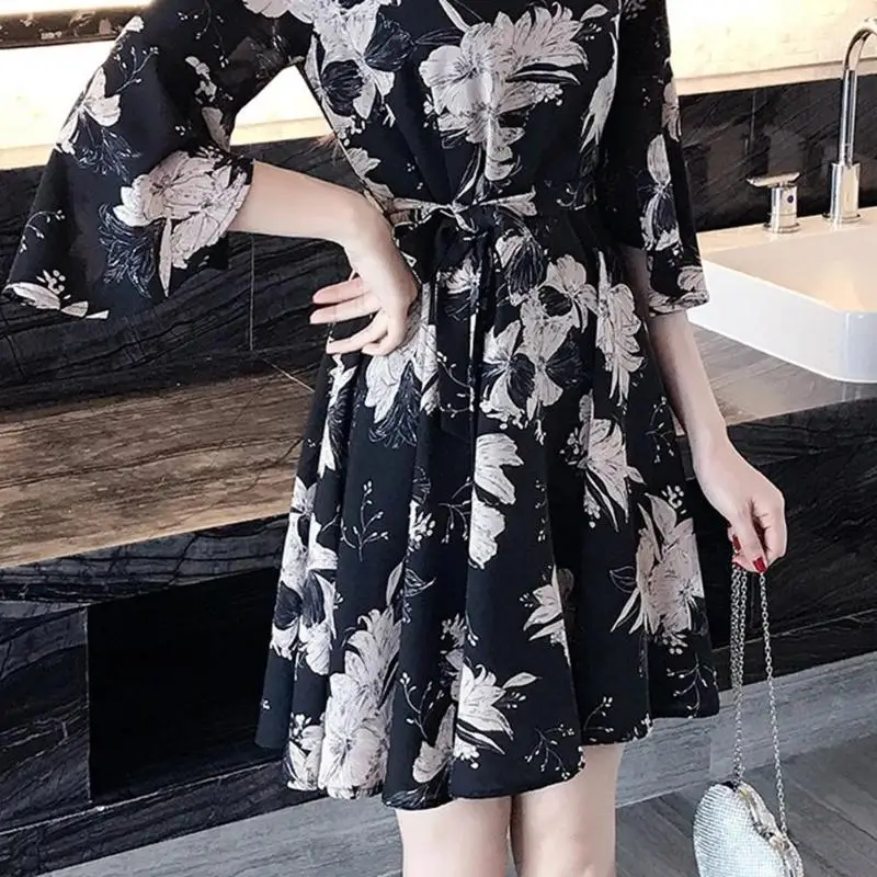 Женское богемное пляжное платье с коротким рукавом и цветочным принтом в Корейском стиле, модная простая одежда с высокой талией