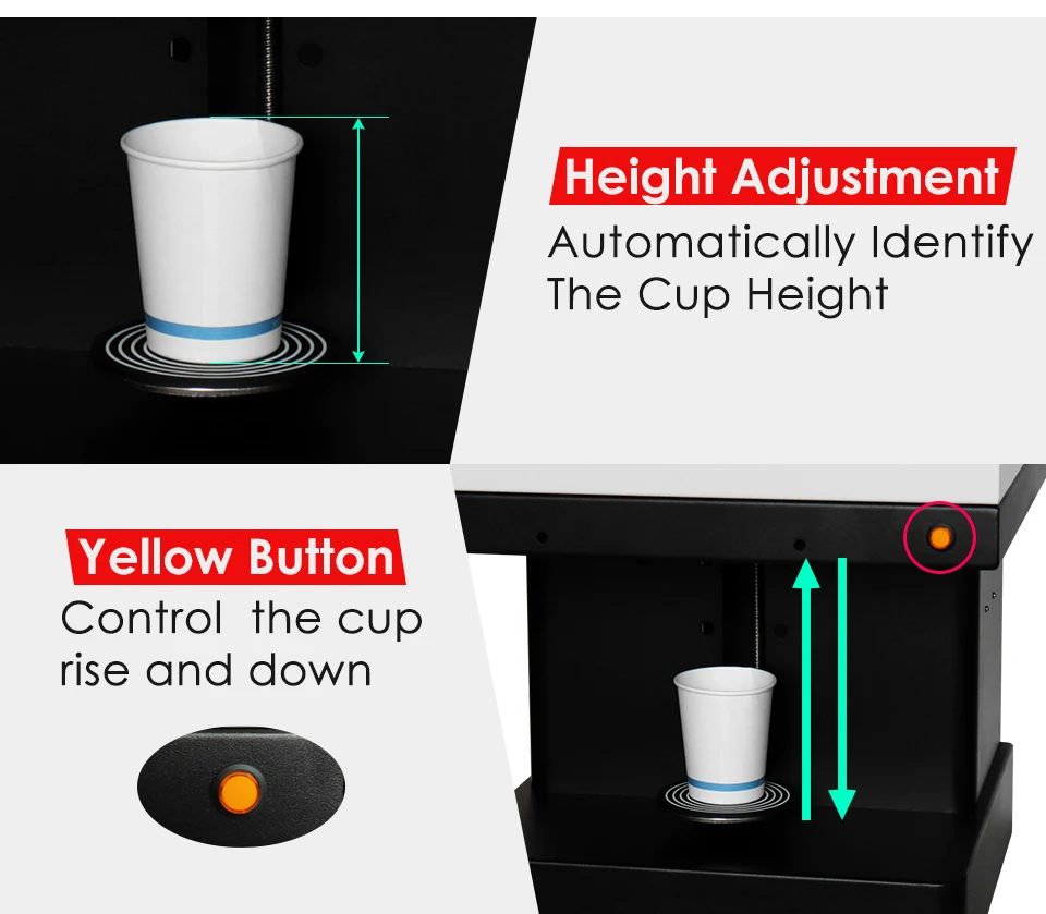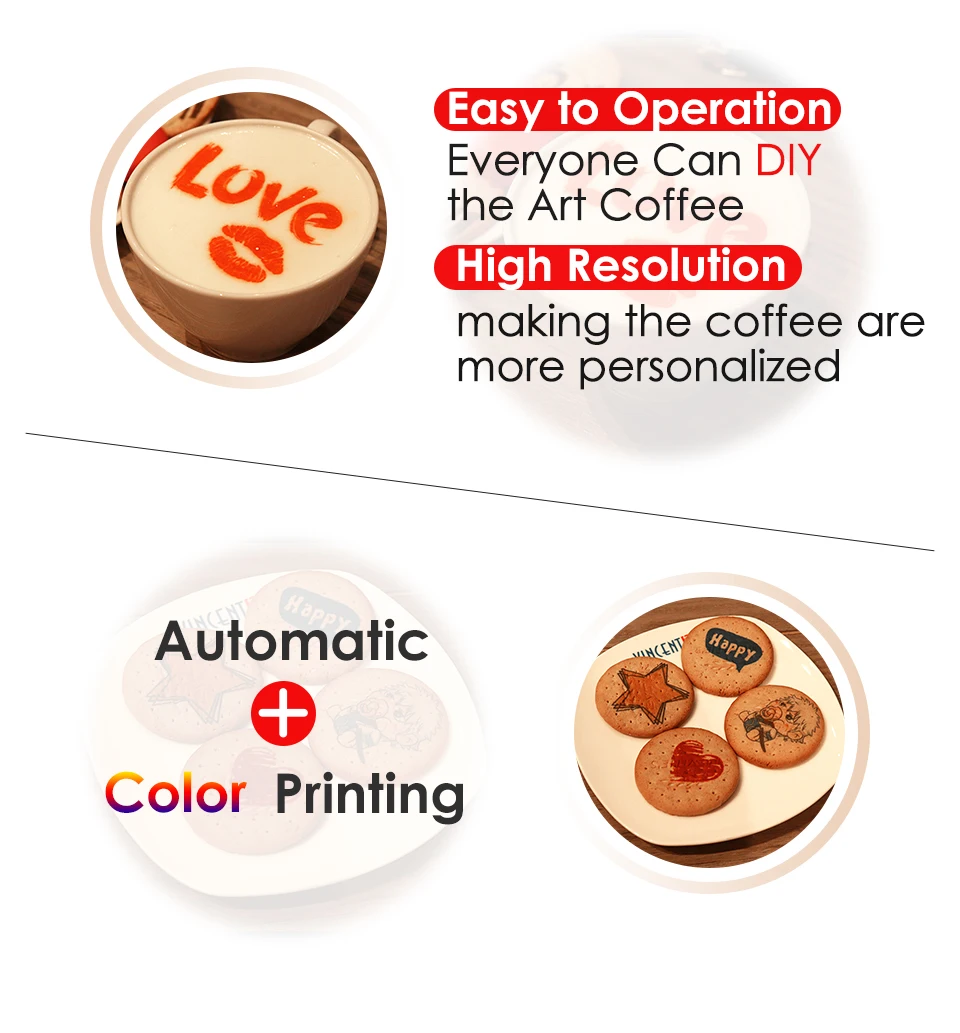 1. Высокоскоростная скорость печати, 20s/30s в чашке. 2. Использование передовых технологий. 3. Чернила, которые мы использовали,Съедобные чернила! 4*100 мл съедобные чернила могут напечатать около 2000-3000 чашек кофе, стоимость очень низкая. 4. Он может печатать на молоке, кофе, напитках и молочном коктейле, пирожных, шоколадах и т. Д., но обратите внимание, что поверхность должна быть белой или с пеной, поэтому изображение может оставаться хорошим! 5. Очень легко управлять этой машиной, мы вышлем вам один CD с обучающим видео бесплатно, когда вы получите наши машины, чтобы помочь вам начать свой бизнес. 6. Мы предложим лучший послепродажный сервис. И если есть какие-либо проблемы, пожалуйста, свяжитесь с нами, мы сделаем все возможное, чтобы удовлетворить ваши потребности!Посылка включает в себя:
