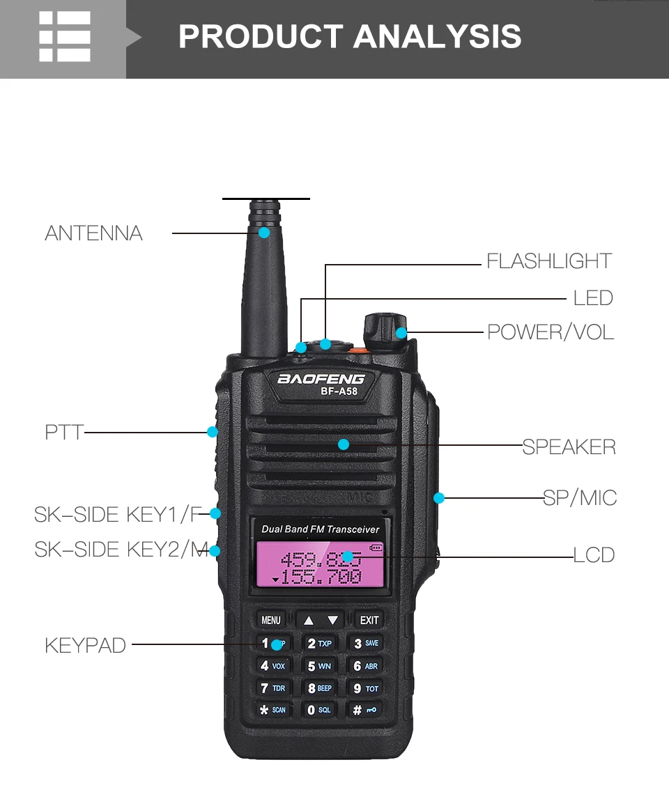 Частотный диапазон: 136,00-174,00 МГц/400,00-520,00 МГц Двухдиапазонный, двойной дисплей и двойной режим ожидания Выход: 5 Вт (В)/4 Вт (м)/1 Вт (Д) 50 CTCSS и 104 DCS коды Водонепроницаемый и пылезащитный Переключатель высокой и низкой мощности Экономия батареи (1800 мАч) Функция VOX Широкий/Узкий выбор ремешка Автомобильная подсветка Подтверждение переадресации реле (1750 Гц) Функция первичного сканирования Замок клавиатуры ATUO Функция блокировки напряженного канала Таймер таймера (TOT) Голосовая подсказка Аварийная сигнализация Предупреждение о низком заряде батареи