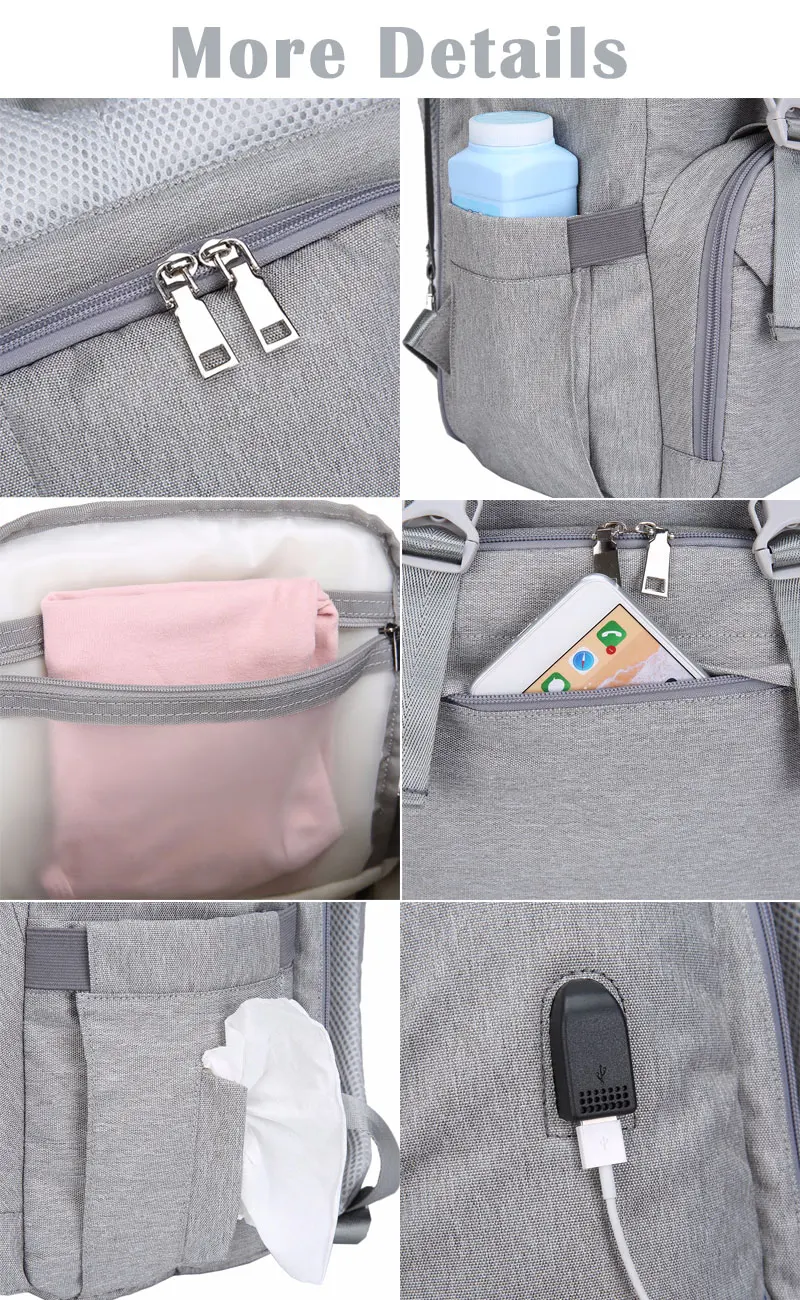 Большая вместимость-Умная Система органайзера имеет отдельные карманы для хранения. Вы можете хранить бутылки молока, одежду и подгузники в отдельных карманах. Многофункциональный-вы можете использовать эту сумку в качестве рюкзака или сумки. Подходит для многих случаев. Спецификация 100% Бренд Материал: нейлон Размер: 40X26X19 см Посылка включает в себя: 1 х Сумки для детских подгузников 1 х USB кабель 2 x ремни