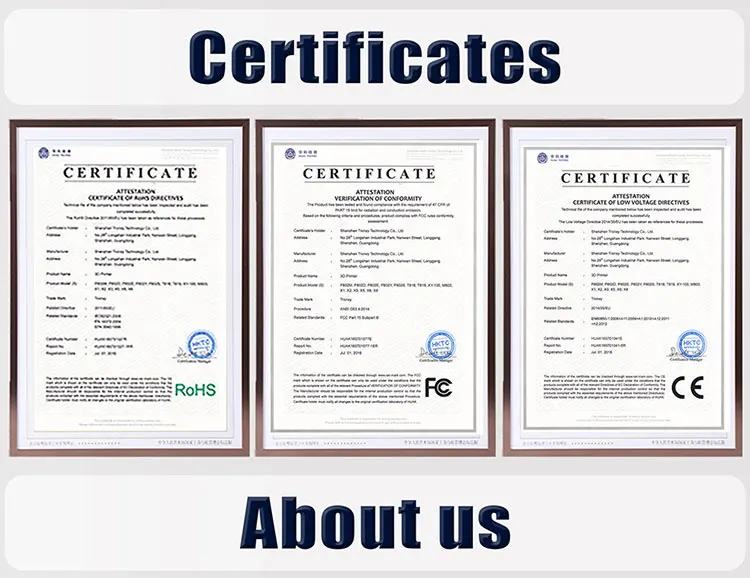 Размер печати: 330*330*400 мм/400*400*400 мм Дисплей: 3,5 дюймов Полноцветный сенсорный экран Machien материалы: алюминиевые профили, листы Детали печати: Скорость печати: 20-100 мм/сек. (advs 60 мм/сек.) Размер насадки: 0,4 мм (по умолчанию) Подключение: USB интерфейс. Tf-карта Цвет печати: один цвет Авто Уровень: Поддержка Сбой питания возобновляется для печати: Поддержка Детектор выхода нити: Поддержка Температура горячей кровати: Поддержка Поддержка материалов: PLA.ABS.HIPS.WOOD.PC.PVC Операционная система: WINDOWS/MACOS/LINUX Температура сопла: ≤ 260 °C Температура окружающей среды: 8-40 °C Толщина: 0,1 мм-0,4 мм (опционально) Влажность окружающей среды: 20-80% Программное обеспечение для нарезки: Программное обеспечение tronxy Формат файлов: STL.OBJ.DAE.AMF.G-CODE Сертификат: CE FCC Потребляемая мощность: 110v/220 В переменного тока, 50/60 Гц Выходная мощность: 360 Вт точность положения: X/y0.0125мм, z0.02мм