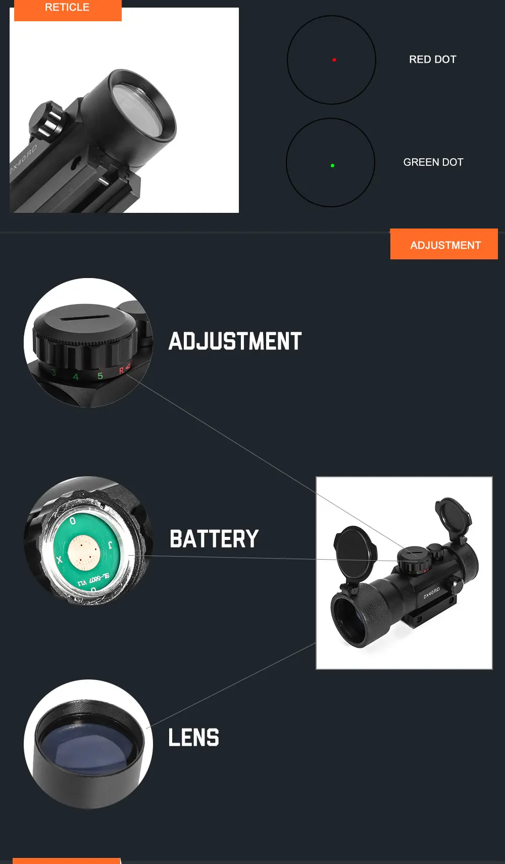 Материал: черный анодированный алюминиевый корпус Цвет лазера: красный зеленый горошек Увеличение: 2x Цвет в горошек: красный и зеленый (светодиодный, 100% безопасный для глаз) 5 уровней контроля яркости Точная Боковая регулировка Точная регулировка высоты, вверх и вниз Идеально подходит для любых погодных условий Питание от 1 литиевой батареи 3 В (CR2032)(не входит в комплект) Рельеф глаз: бесплатно Пыленепроницаемый, ударопрочный и противотуманный Тип рельса: тканевая рейка 11 и 20 мм