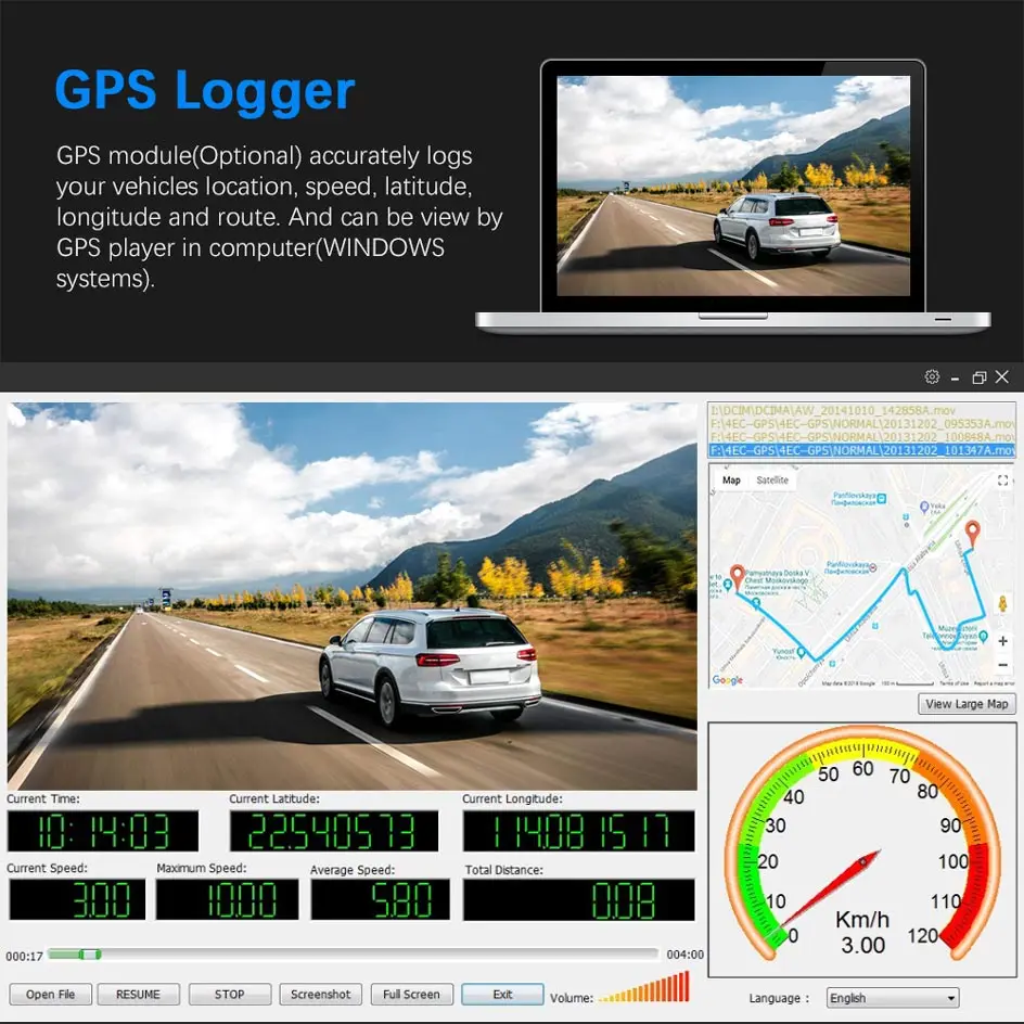 GPS модуль (опционально) точно регистрирует местоположение, скорость и маршрут вашего автомобиля. И может быть просмотрен gps-плеером в компьютере (системы WINDOWS).