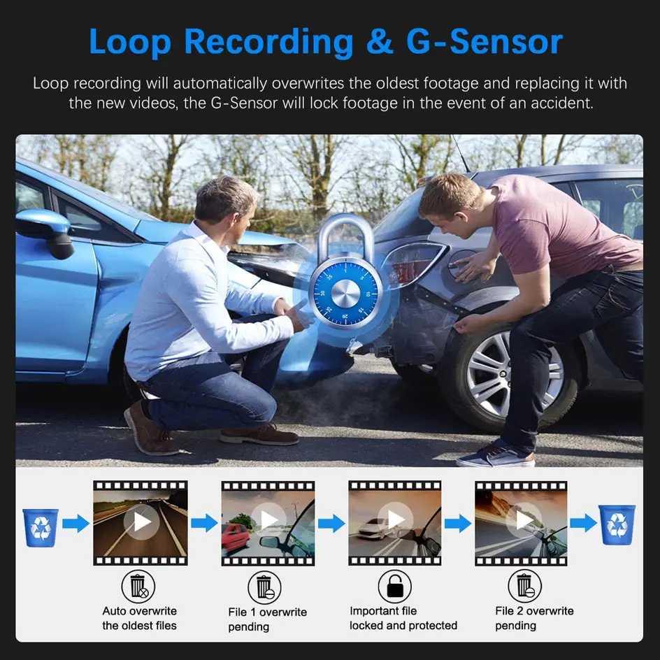 Кадры хранятся в петлях 1/ 3 минутных сегментов в соответствии с вашими настройками. Бесшовная циклическая запись перезаписывает самые старые кадры с новейшими после заполнения карты до емкости. G-сенсор будет блокировать кадры в случае аварии, заблокированные фрагменты не будут перезаписаны.