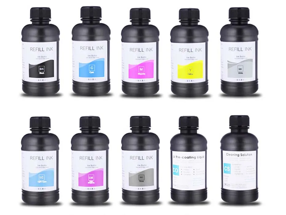 УФ чернила является одним из основных расходных материалов для ультрафиолетовых принтеров. УФ-чернил для струйной печати, выбранного для ваших цифровой принтер должен зависеть от тех товаров, которые вас украшают как Специализированные чернила лучше всего подходят для конкретных подложках. УФ чернила проектируют секцию освещения с использованием дневных огней на широком диапазоне применений из пластика, стекло, металл, и дерева к другим нетрадиционной поверхностей, таких как предметами одежды. УФ-чернил для струйной печати доступен в твердой и мягкой чернил.