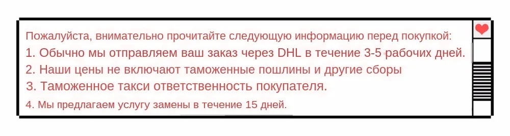 Доставка товара: мы организуем доставку в течение 2 дней после оплаты, и она будет доставлена в течение 3-7 дней по всему миру dhl, как правило (Покупатель несет ответственность за таможенный налог в вашей собственной стране)