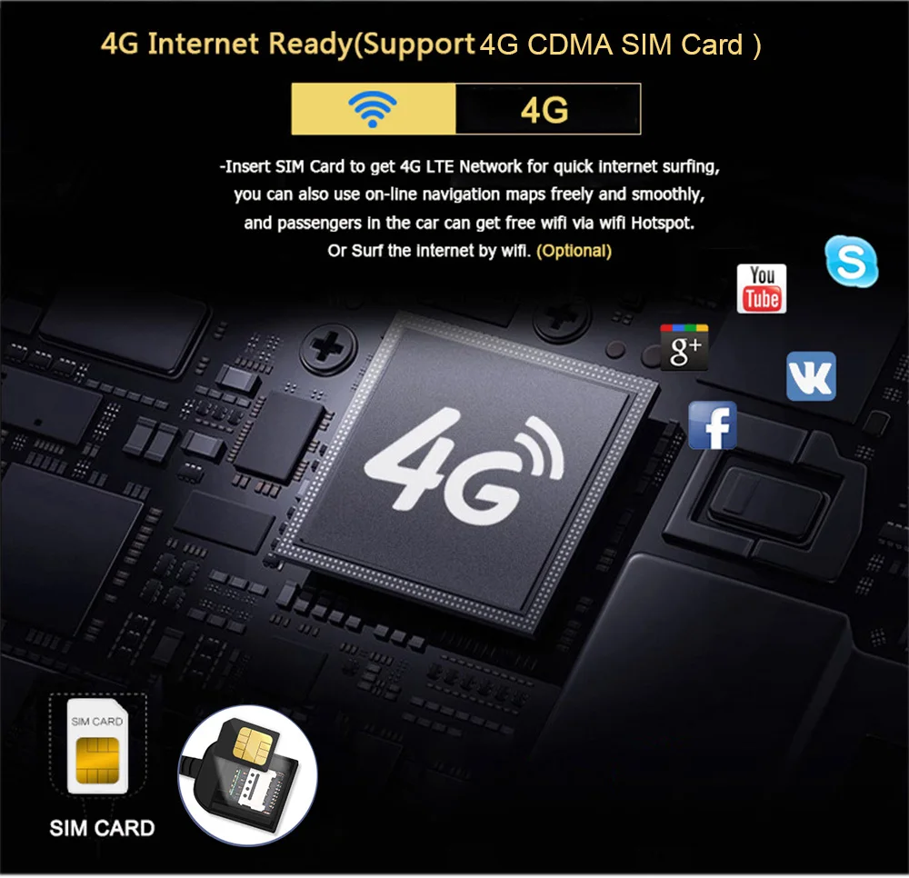 Поддержка сети 3G/4G: поддержка CDMA сим-карта, внешний автомобильный слот, если ваш регион не поддерживает сигнал CDMA, нужно купить 4G модем, если вы хотите купить его, пожалуйста, свяжитесь с нами Поддержка функции Wi-Fi: поделиться мобильным телефоном Wifi точка доступа