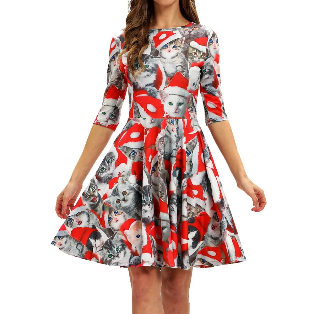 Женское модное мини-платье с коротким рукавом и принтом рождественского кота в винтажном стиле