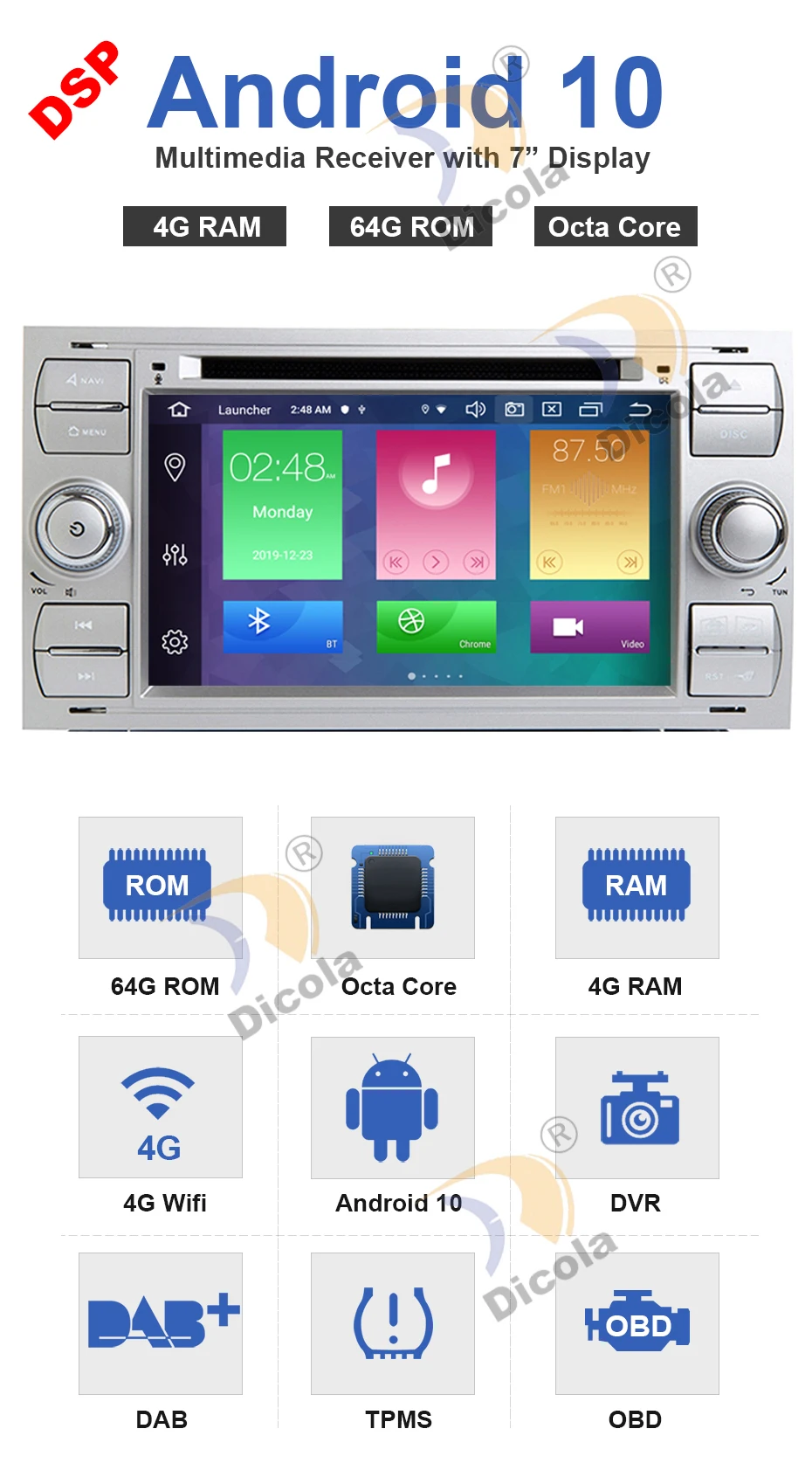 Чистый Android 10!DSP!7InchCar dvd-плеер для Ford FocusWith рулевое колесо управления +Восьмиядерный процессор+4 Гб оперативной памяти+64 Гб ROM+1024*600 IPSЭкран + емкостный экран + Wifi +3G/4G(3G/4G ключ опционально)+ Gps-навигация +IPhone/Android мобильный телефон зеркальная ссылка+ Bluetooth 5,0 (A2DP/Телефонная книга) + FM/AM + RDS +Видеорегистратор (опционально)+OBD II (опционально)+1080P Vedio Play+DAB (опционально)+Автомобильная игра (опционально)+Дополнительный микрофон+Бесплатная карта+Камера заднего вида+Инструменты для ремонта