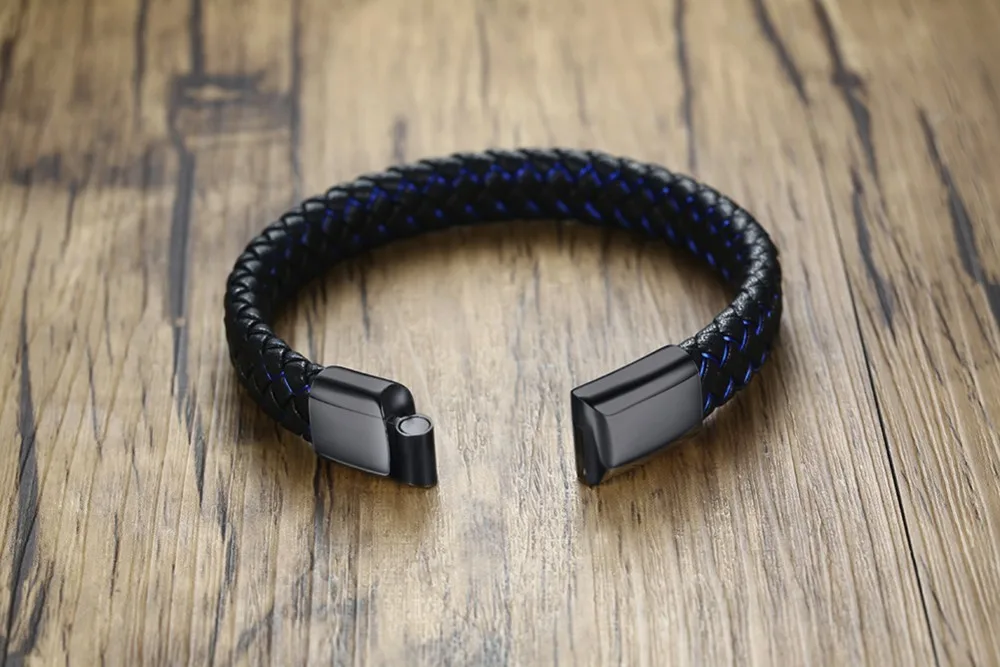 Тонкий сине-черный плетеный кожаный браслет с магнитной застежкой из нержавеющей стали-Покажите свою поддержку синего цвета!