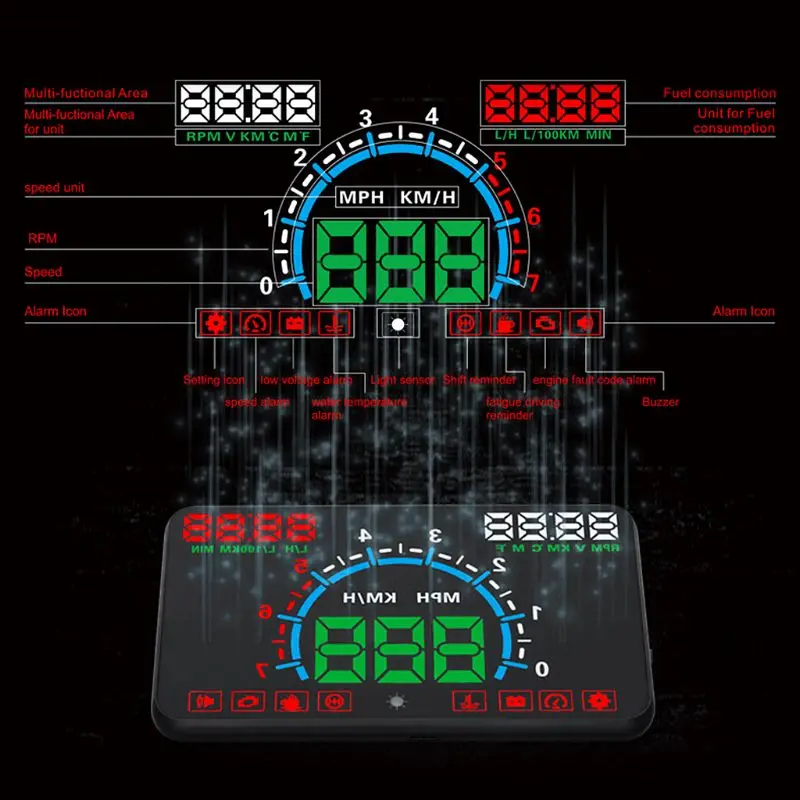 HUD короткий для дисплея головы вверх. Он отображает данные о вождении на лобовом стекле, такие как скорость, об/мин, расход топлива, температура воды, напряжение; Избегайте вождения становятся опасными из-за просмотра инструмента во время вождения.