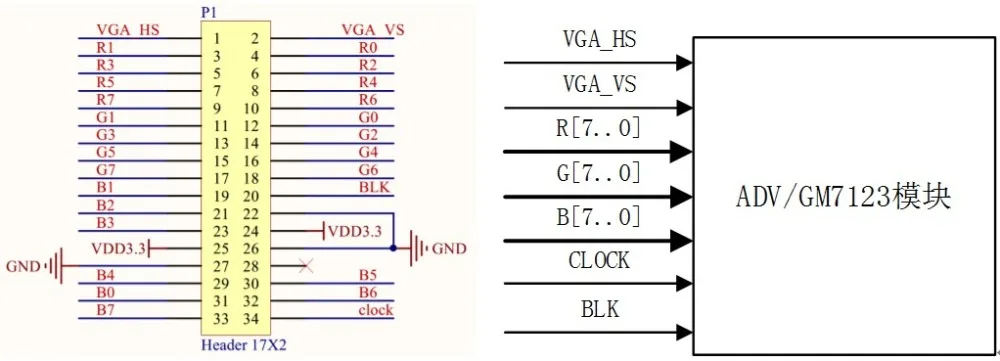 Модуль выбирает 8 бит каждого из трех каналов DAC чипа GM7123 в качестве порта ввода данных и 2 бит низкого уровня для сброса. Поэтому формат RGB888, т. Е. Цвет 24 бит, поддерживается по умолчанию. Качество графики полностью достигло стандарта дисплея ПК. Модуль ведет к VGA_HS, VGA_VS, часам, BLK (пустой), R7 ~ R0, G7 ~ G0, B7 ~ B0, 3,3 V, G. Сигнал ND. Для пользователей просто подключите эти сигналы правильно и дайте правильный стандартный сигнал VGA.