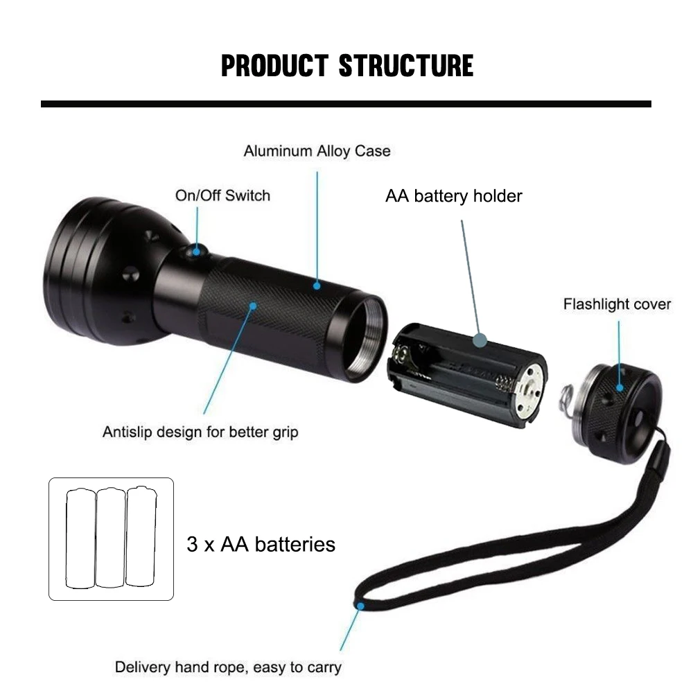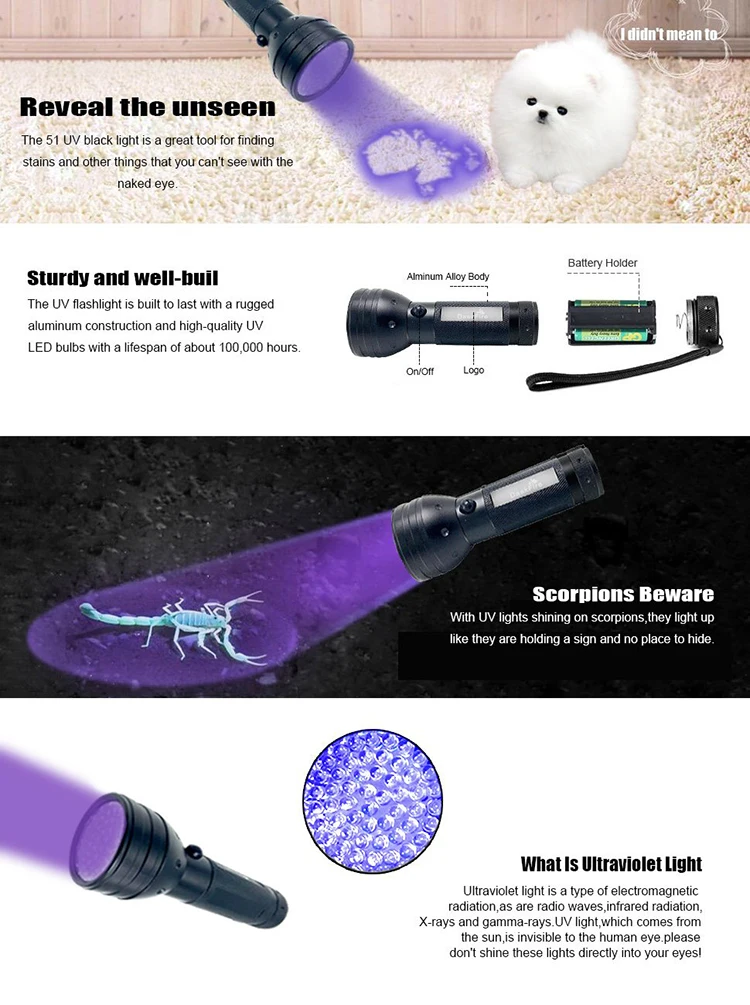 Использование ультрафиолетового УФ-светодиодный высокомощный фиолетовый Длина волны лазера: 395-410nm Батарея: Используйте одну 3,7 V 14500 или батарейки типа АА (не входят в комплект) Задний переключатель, портативный, легко носить с собой Применение: маска, средства по уходу за кожей, детская одежда, подгузники, гигиенические салфетки, туалетная бумага и другие предметы первой необходимости жизни, Детектор денег, ночная рыбалка, согласно дрейфу, в соответствии с молитвенными бусинами, согласно следам судмедэкспертного класса специального назначения промышленности использования Уф может использоваться для обнаружения флуоресцентных веществ: длина волны 395-410нм УФ-отпечатки пальцев и другие жидкости для тела могут быть использованы, проверка остатков Посылка Содержание: 1 x УФ фонарик Аккумулятор в комплект не входит
