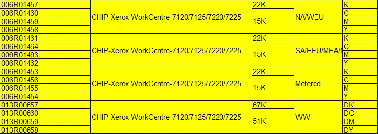 Этот чип имеет несколько различных номеров картриджей, пожалуйста, внимательно проверьте свой номер картриджа и выберите правильный. NA/WEU 006R01457 006R01460 006R01459 006R01458 SA/EEU/MEA/Мексика 006R01461 006R01464 006R01463 006R01462 Дозированный 006R01453 006R01456 006R01455 006R01454 Номер барабанного картриджа 013R00657 013R00660 013R00659 013R00658 Как проверить правильные номера картриджей: