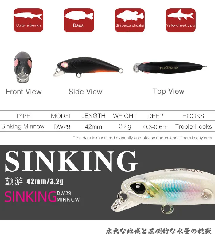 TSURINOYA DW29 погружающаяся гольян жесткая рыболовная приманка 42 мм 2,8 г мини Гольян глубина погружения приманки 0,3-0,6 м Isca Искусственные воблеры Pesca Особенности: 1. Приманка тонет быстро, когда она падает, и обеспечивает жесткую, пульсирующую вибрацию при вытягивании через воду. 2. Несмотря на небольшой рост DW29, он бросится как пуля-даже при сильном ветре головы или боковом ветре. 3. Приманка предлагает обтекаемый профиль, который может быть обработан через области толстого покрытия с небольшим количеством зацепок. 4. Маленький размер, но большой на деталях, приманка обеспечивает ультра-реалистичную имитацию приманки, которая обманет самых опытных хищников. 5. Приманка имеет вес хвоста, чтобы обеспечить исключительное расстояние отливки, а также производит громкий звук стука, чтобы помочь вызвать рыбу на больших расстояниях. 6. Приманка, несомненно, привлечет внимание баса с его высоко отражающими свойствами и энергичным действием. Подробная информация о продукте: 1. Цвета: A,B,C,D,E,F,G,H,I,J 2. Вес: 3,2 г 3. Длина: 42 мм 4. Плавучесть: оседающая на дно приманка 5. Глубина погружения: 0,3-0,6 м 6. Посылка: 1 шт.