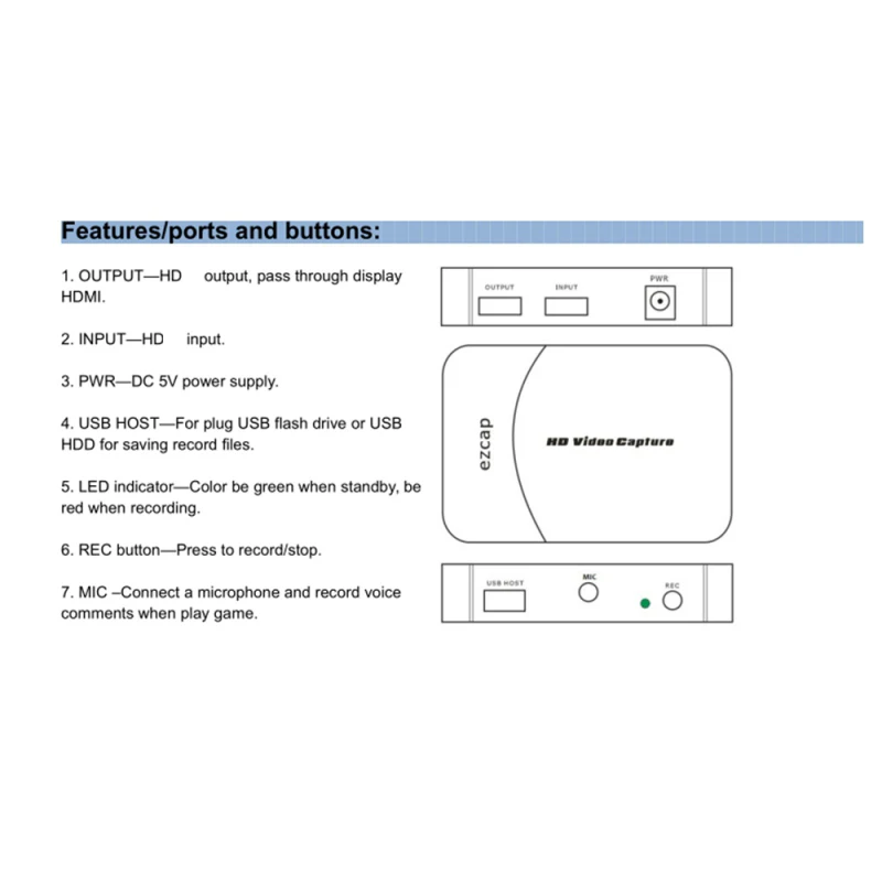 Характеристика: 1080P HD захват-HD видео рекордер захватывает видео и игры до 1080P, а затем сохраняет их на флэш-накопитель USB или HDD, эта карта захвата не поддерживает прямой эфир Сохранить на usb-устройстве-непосредственно Подключите один usb-накопитель (только поддержка FAT32), чтобы получить видео в любом месте, в любое время; Поделитесь игровым процессом и Веселитесь с друзьями, где бы вы ни находились; поддерживает до 128G для usb-накопителя и 2 ТБ для жесткого диска; Работает только с USB2.0 Mic-in для комментариев-с дополнительным аудио входом позволяет записывать свой голос (без разговора) с микрофоном в режиме реального времени видео геймплей вместе; звука с микрофона может быть услышан в тех случаях, когда вы рассматриваете записанное видео, чтобы на компьютере, не слышно во время записи, будто совместим только с 3,5 мм три секции микрофон гарнитуры Простая установка-легко работать без какой-либо регулировки, сохранять видео на usb-устройстве, не работает с ПК напрямую, 1080P Запись одним касанием, и нажмите кнопку снова, чтобы остановить запись Широкое применение-Совместимость с большинством hd-выходов, вы можете снимать видео 1080P через Xbox 360, Xbox One, PS4, Wii U, STB, DVD, BlueRay или другие источники видео; не работает для устройств с HDCP 2,2; Посылка HD игровой рекордер Источник питания DC 5V 2A Руководство по эксплуатации CD Программное обеспечение для редактирования видео