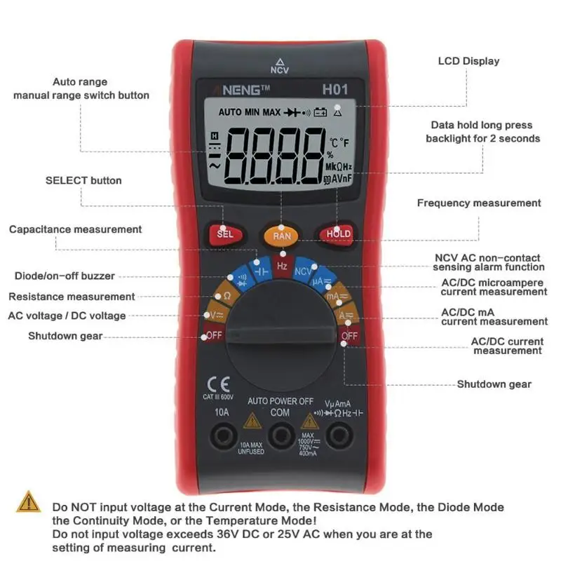 ANENG H01 4000 отсчетов Авто Диапазон Цифровой мультиметр Подсветка AC/DC Амперметр Вольтметр Ом портативный провод тест-метрОписание:ANENG H01-это автоматический цифровой мультиметр с питанием от аккумулятора и 4000 счетами, ЖК-дисплеем и подсветкой. Его можно использовать для измерения напряжения переменного/постоянного тока, переменного/постоянного тока, сопротивления, емкости, частоты, рабочего цикла, диодов и непрерывности.