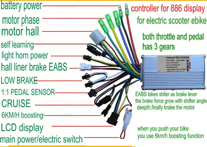 6. Самообучение --Это первое, что вам нужно сделать, если вы хотите сделать все правильно, -- Используйте самообучающийся провод, чтобы найти правильное совпадение фазового провода контроллера и провода датчика Холла с проводом фазы двигателя и проводом датчика Холла,Способ работы: Подключите кабель питания, провод главного переключателя, провод двигателя, провод холла, Провод ручки, провод обучения, переключатель питания и замок велосипеда, двигатель начнет работать. Если направление поворота правильное, отключите провод обучения. Обучение завершено. Если направление противоположное, пожалуйста, отключите обучающий провод, двигатель автоматически переключит направление, работает 2-3 секунды, отключает обучающий провод, обучение завершено. (обратите внимание! Отрежьте провод обучения после обучения)