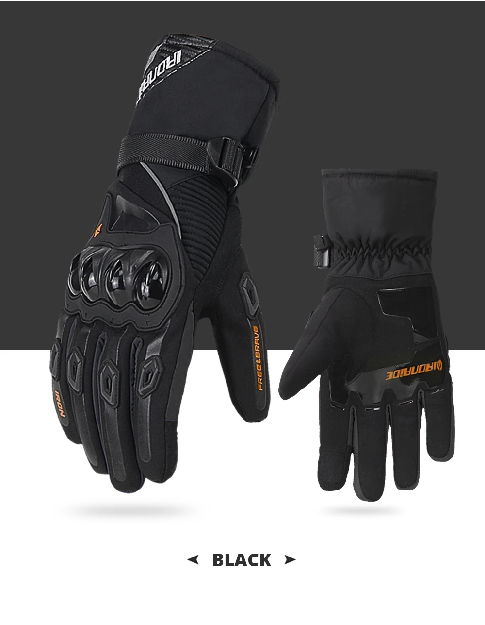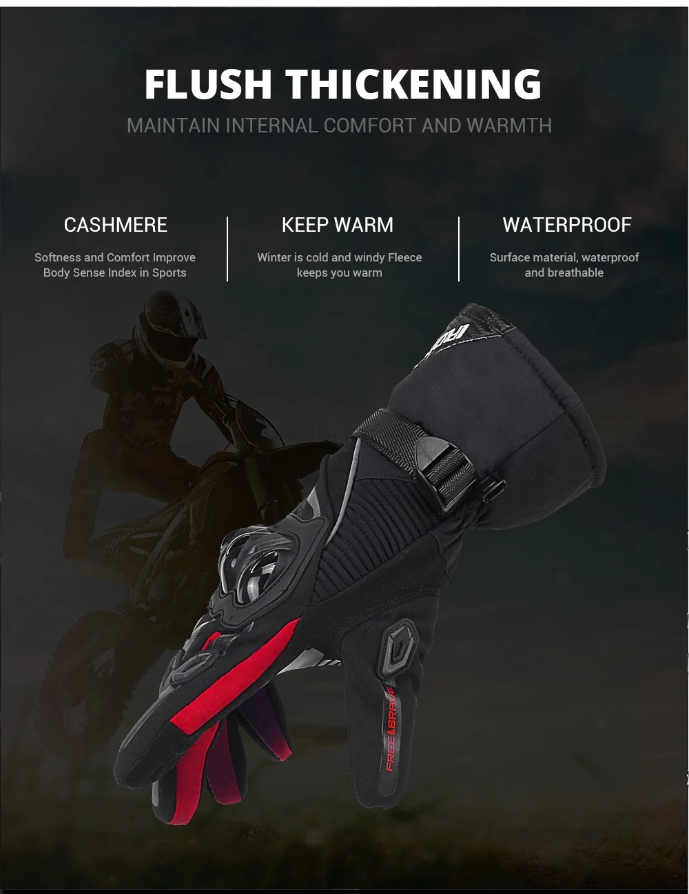 温暖和防风:内衬软触摸层,长袖口防风,可调节腕收紧带,保持你的手温暖当骑快冬天雪冷的天