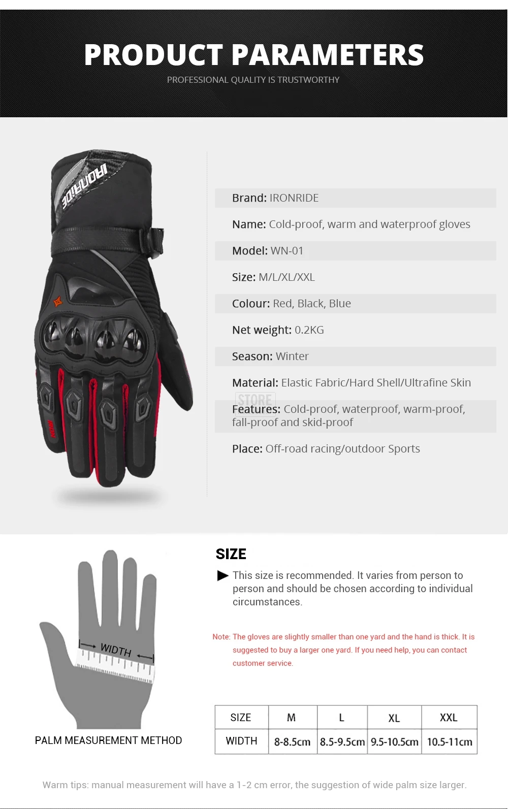 触屏功能:内置特殊材料在食指上,允许你使用你的手机,不需要脱下手套在寒冷的天