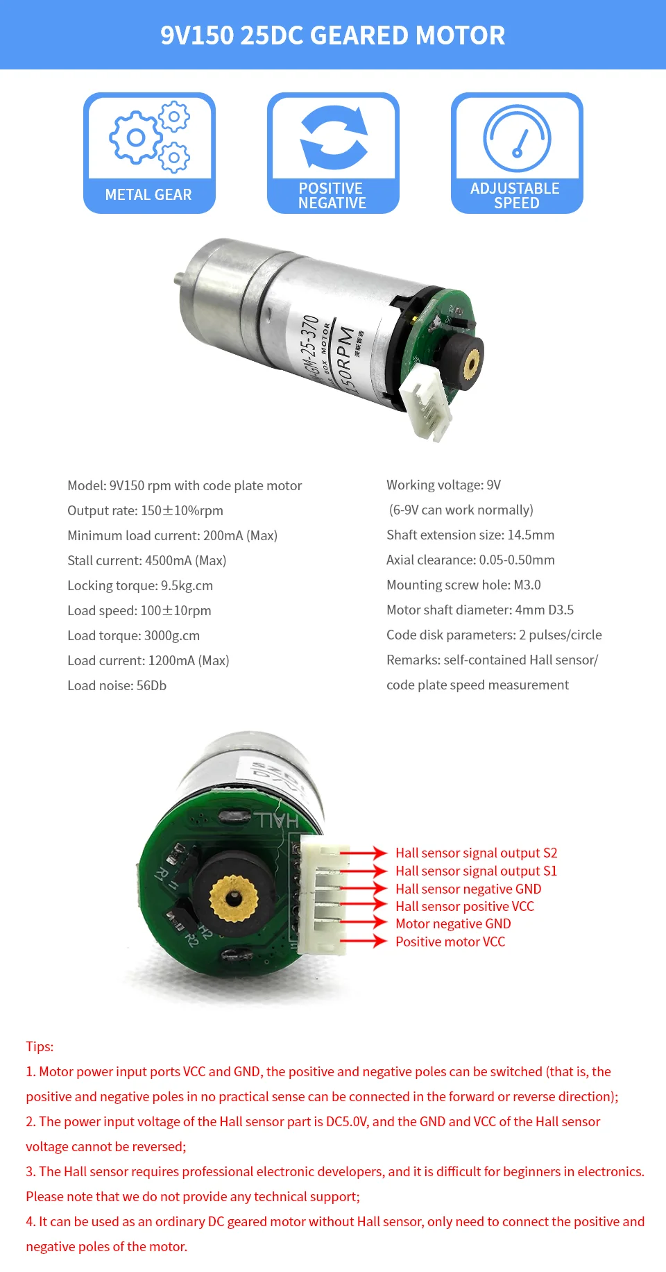 Тип двигателя: 9 В/150 об/мин мотор с датчиком Холла или 12 В/330 об/мин мотор без датчика Холла