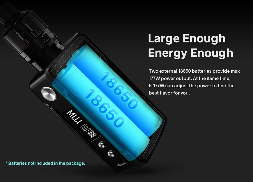 1) Размер: 51x26,5x134,4 мм (стандартный) 2) Емкость: 4,5 мл 3) Батарея: двойная 18650 (не входит в комплект) 4) Диапазон мощности: 5-177 Вт 5) Диапазон сопротивления: 0,05-5,0 ом 6) Цвет: B-Ink, B-Aurora, B-Dawn, B-головоломка, B-Scarlet