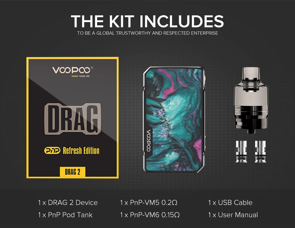 Устройство DRAG 2-1 шт. 1 x PnP Pod Tank 1 x PnP-VM5 0.2Ω 1 x PnP-VM6 0.15Ω 1 x USB-кабель 1 x Руководство пользователя