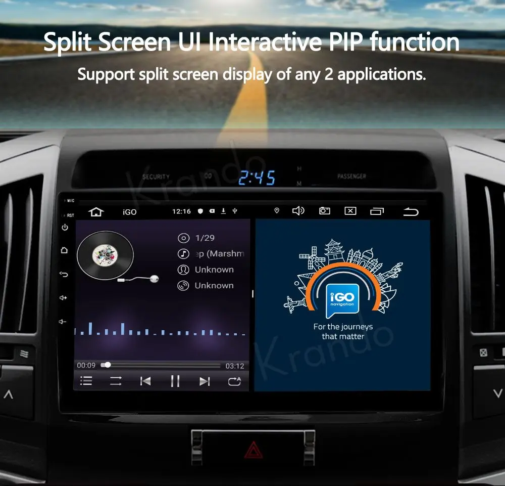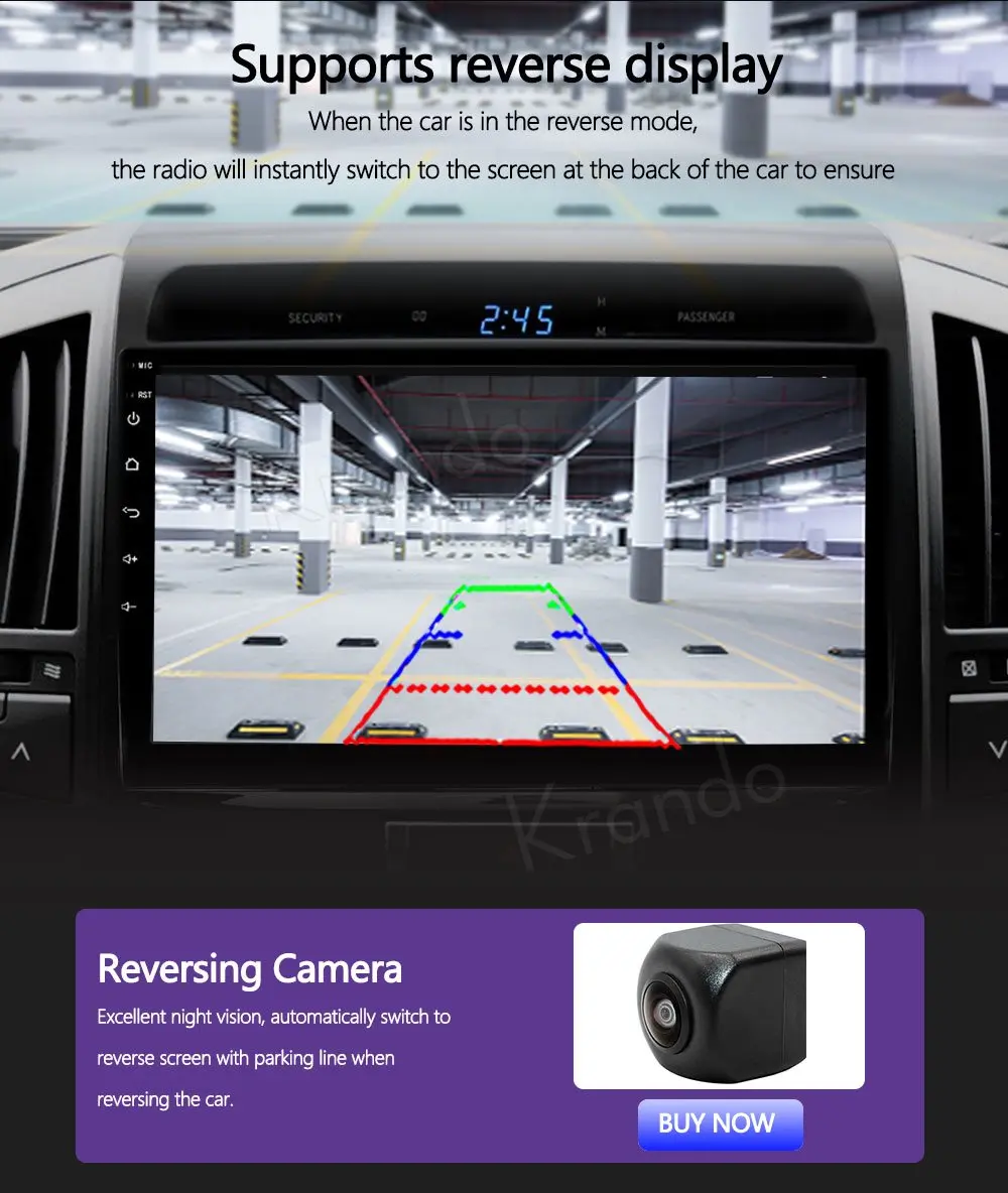 Когда автомобиль находится на заднем ходу, это устройство автоматически переключается на изображение камеры заднего вида с помощью линии парковки. (Krando представляет резервную камеру в подарок бесплатно).