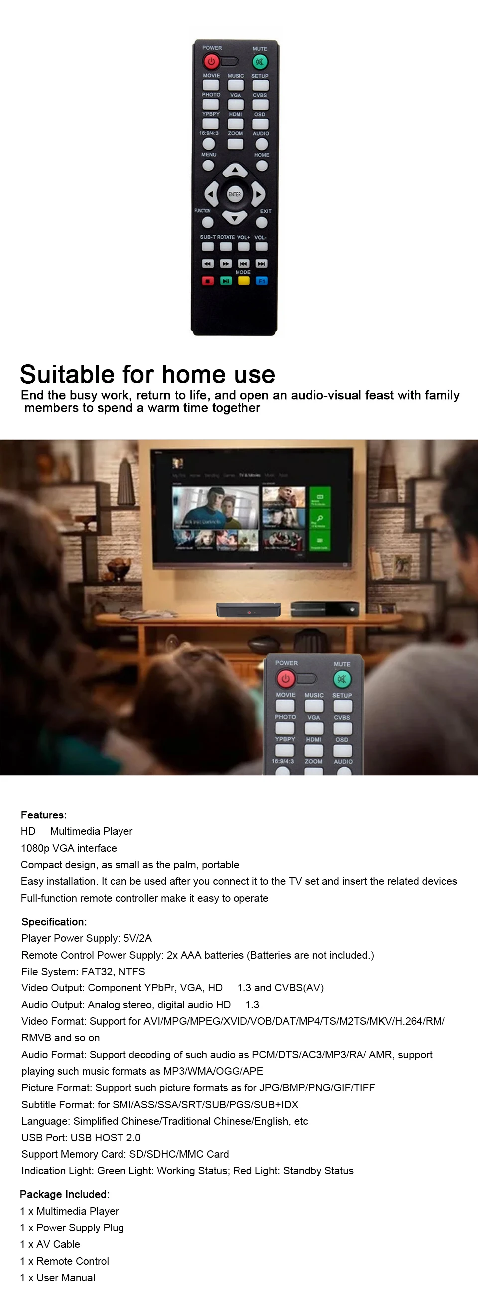 Описание:У вас есть тысячи видео, музыки и фотографий, хранящихся на жестком диске USB. Вместо того, чтобы смотреть его на мониторе компьютера, теперь вы можете просто взять ваш жесткий диск USB для подключения к мультимедийному проигрывателю HDD и наслаждаться мультимедийным контентом на вашем HDTV.Спецификация:Мультимедийный HDD плеер 1080P поддержка SD карты, HDD, MS картыОсновной набор микросхем: F10Интерфейс sd-карты: Поддержка sd-картыИнтерфейс sd-карты: Поддержка sd-картыИнтерфейс USB: порт USB 2,0, подключите другой u-диск или sd.Поверхность: алюминиевый корпус с проводным рисункомТип жесткого диска FAT32,NTFSВидео форматы RMVB/RM(RV8/9),H.263,H.264(MOV/MP4/M4V),MPEG-1/2(VOB),MPEG- 4(XVID/DIVX),WMV7/VC-1,MKV,AVI,TS/TP,VOB,PMP,FLV.Аудио форматы MP3,WMA,AFE,FLAC,OGG,APE,AAC,AC3 и DTSФорматы фотографий JPEG,GIF,BMP,PNG.Форматы подзаголовков SMI, ASS, SSA, SRT, SUB.Воспроизведение видео 4:3 или 16:9Язык поддерживает простой китайский/традиционный китайский, английский, русский, португальский, испанский, венгерский и корейский.Самый высокий видеовыход 1080PАудио выход интерфейс HD 1,3 цифровой, L/R стерео, OPT.Входная мощность 100-240 В, выход: 5,2 В/1.5A.Видео выход Интерфейс HD /AV/VGA. Другие поддерживает вращение фото, масштабирование и слайд-шоу.Аксессуары1XMini HD медиаплеер1 пульт дистанционного управления (без аккумулятора)1x Руководство пользователя1x адаптер питания1xAV кабель1xhdmi кабель![]()