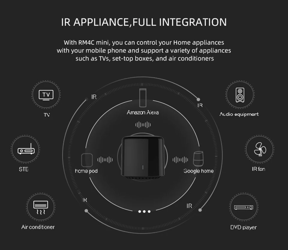 100% абсолютно новый и высококачественный портативный и прочный, легко носить с собой, легкий этот продукт-революционный Умный интеллектуальный контроллер прибора.Это первый хороший интеллектуальный пульт дистанционного управления. Кондиционер, телевизоры, приставки и другие приборы можно легко управлять, мобильный второй пульт дистанционного управления.Разработан, чтобы помочь вам получить больше контроля и работать лучше. Это позволяет вам умышлять свой дом в любом месте, а также в любое время.RM4 Cmini-это настоящий универсальный пульт дистанционного управления со следующей поддержкой 80000 + телевизоров, кондиционеров, аудио...Автоматическое обновление кодов с облачного автоматического устройства без обученияПоддержка ИК-пульта дистанционного управления бытовой техники iOS/Android app управления из любой точки дома/вдали режим, режим сна/пробуждения, режим родителей и режим безопасностиПоддержка всех ИК-устройств, таких как телевизор, кондиционер, DVD и т. Д.Не поддерживает удаленный настенный выключатель, не поддерживает электрические шторы и так далее ИК-сигнал не проходит через препятствияПоддержка Wi-Fi 2,4 ГГц b/g/Поддержка приложения для Android 4,0 и IOS 7,0 или вышеУправляйте своим телевизором с помощью смартфона через interneВы можете установить время загрузки телевизора/кондиционера/DVD в advanc Поддержка авто режимов, авто дома и автоУниверсальный ИК-контроль TV, STB, AC, DVD plater, AMP...Поддержка Wi-Fi \ 3G \ 4G управленияЛокальный ИК-код для более быстрого ответаАксессуар для внешнего датчика![]()