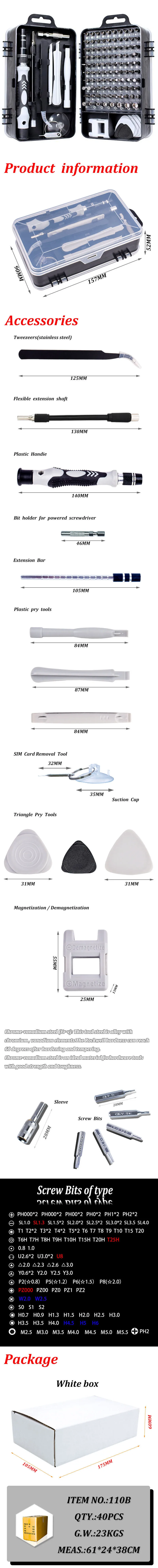 Набор отверток 115 в 1 детали: 17 аксессуаров для разборки 1 x ручка 1 х гибкий Удлинительный вал 1 x удлинитель 1 пинцет 3x пластиковые инструменты 1 x удаление sim-карты 1 х намагничиватель/размагничиватель 1 x присоска 6 отверстий 1 х держатель для отвертки 98 бит отвертки Phillips: 2 * PH0000 2 * PH000 2 * PH00 2 * PH0 2 * PH1 2 * PH2 Прорези: SL1.0 SL1.3 SL1.5 2 * SL2.0 2 * SL2.5 SL3.0 SL3.5 SL4.0 Трокс: T1 2 * T2 2 * T3 2 * T4 2 * T5 T6 T7 T8 T9 T10 T15 T20 Трокс с отверстием: T6H T7H T8H T9H T10H T15H T20H T25H Пятиугольник: 2 * P2 【☆ 0,8 】 2 * P5 【☆ 1,2 】 P6 【☆ 1,5 】 P8 【☆ 2,0 】 Шестигранная: H0.7 H0.9 H1.3 H1.5 H2.0 H2.5 H3.0 H3.5 H4.0 H4.5 H5 H6 POZI: PZ000 PZ00 PZ0 PZ1 PZ2 Три точки: 2 * Y0.6 Y2.0 Y2.5 Y3.0 Треугольник: 2,0 2,0 2,3 2,3 2,6 2,6 3,0 3,0 Форма «U»: 2 * U2.6 2 * U3.0 U8 Квадрат: S0 S1 S2 Средняя: W2.0 W2.0 SIM: 0,8 1,0 4 мм разъем: M2.5 M3.0 M3.5 M4.0 M4.5 M5.0 M5.5 ICS: PH2