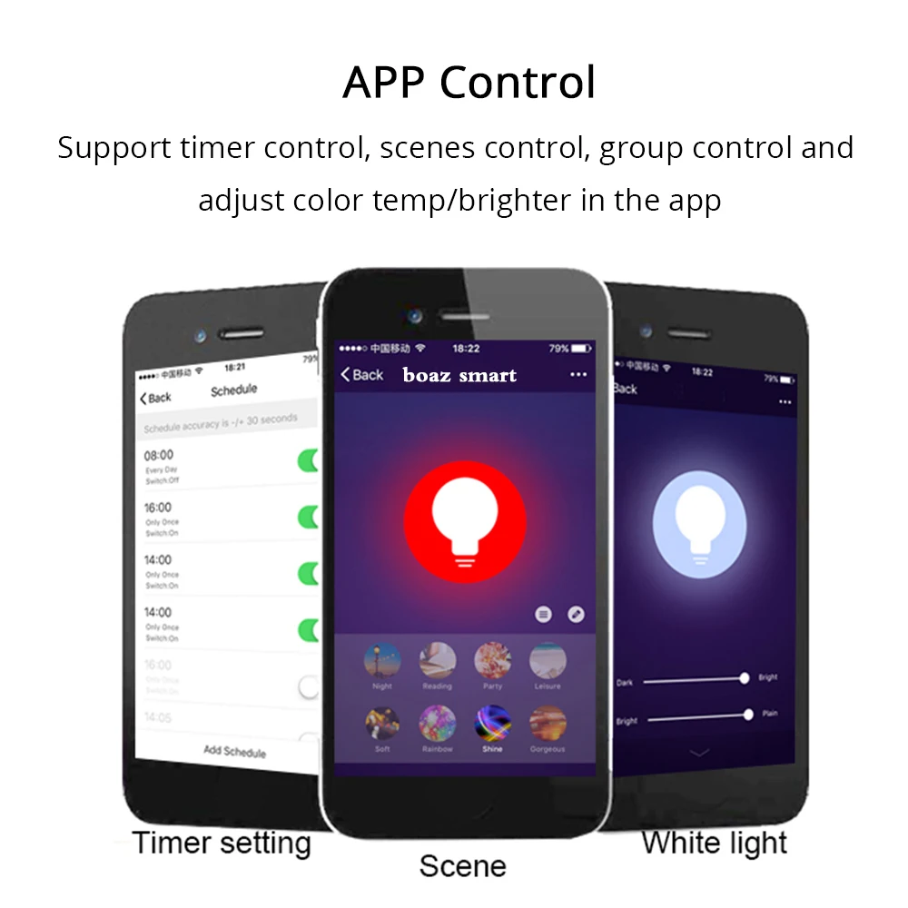 Параметры: Напряжение: 85-240 В Управление: приложение WIFI (Smart life или TUYA smart),Amazon Alexa,Google assistant Мощность: 10 Вт Цвет: теплый белый RGBCW Беспроводной стандартов: 802.11b/g Световой поток: 800-900lm Рабочая температура: от-5 до 45