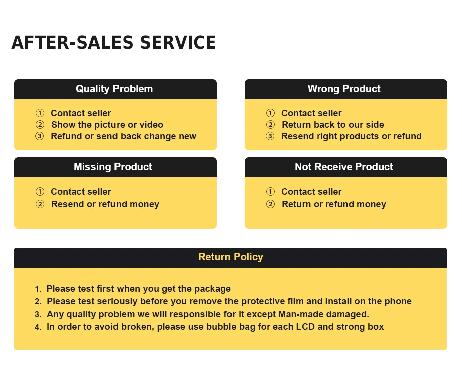 Примечание: 1. Пожалуйста, сообщите нам цвет ЖК-дисплея. Есть разные цвета ЖК-дисплея, такие как классные цвета или теплые цвета. Потому что клиенты разных стран любят разные цвета. 2. Пожалуйста, сообщите нам стоимость счета-фактуры. Если вы не сообщите нам, сколько мы должны написать в счете-фактуре, мы напишем стоимость, как наш опыт. Но мы не несем ответственности за любые проблемы в таможне вашего курьера. 3. Пожалуйста, проверьте экран в течение трех дней после получения товара. Сначала проверьте экран, затем вы установите его на свой телефон, если это не проблема. При возникновении любых вопросов, пожалуйста, свяжитесь с нами.