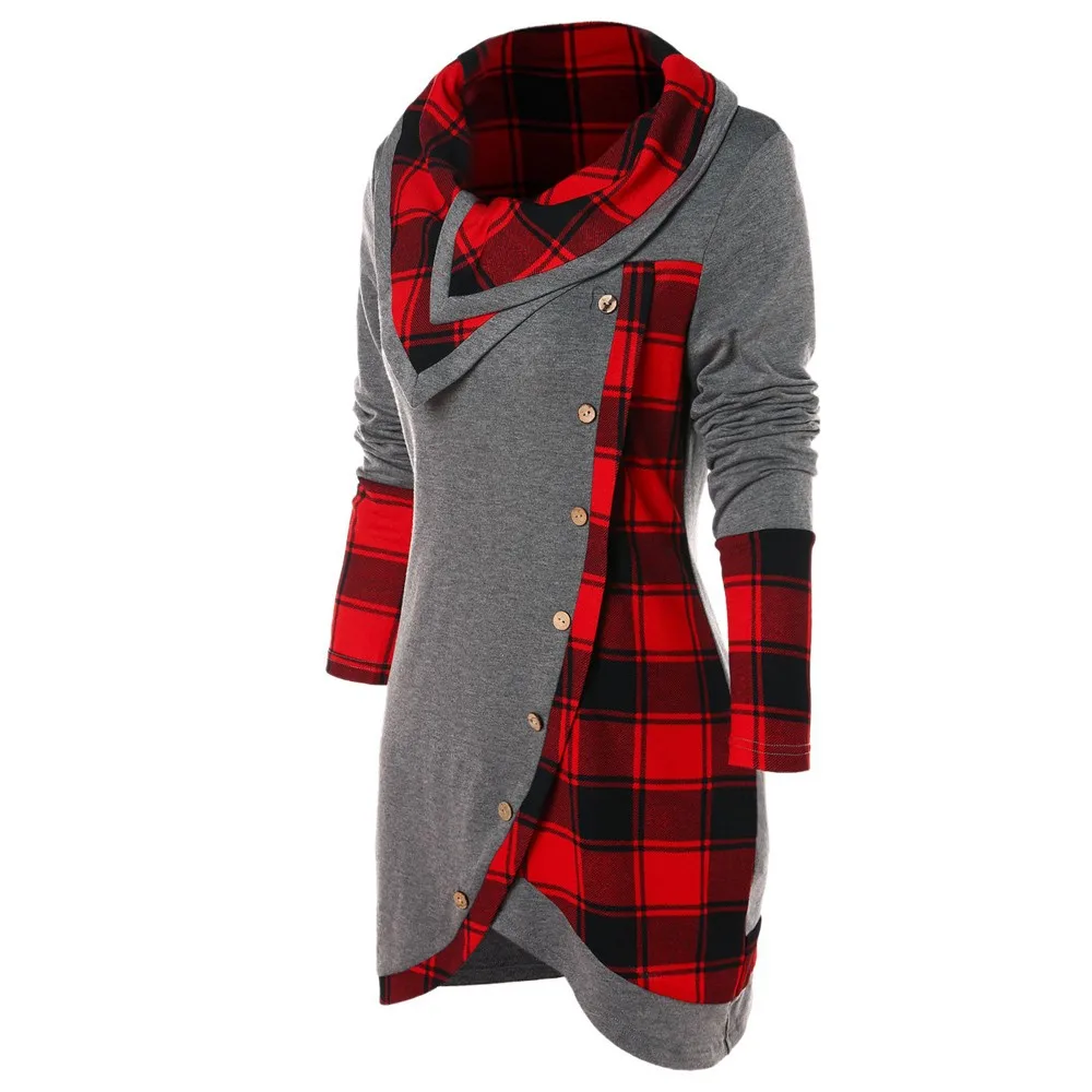 Женская блузка с длинным рукавом и асимметричным подоломВ клеткуКнопкаВодолазка в клетку; Туника; Свитер; Пуловер; Топы