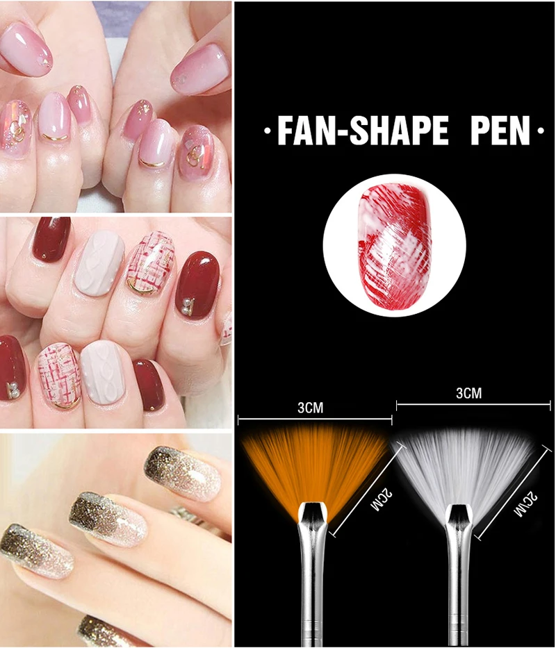 1. Три инструмента для рисования 2. Семь инструментов для рисования (также можно использовать в качестве гелевых кистей для отверждения ногтей) 3. Два вкладыша 4. Один инструмент для заточки 5. Две веерные кисти для эффекта нейл-арта (также можно использовать как кисть для теней для век)