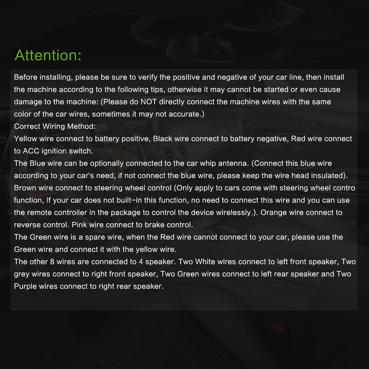 Перед установкой, пожалуйста, убедитесь, что вы проверили положительную и отрицательную линию вашего автомобиля, затем установите машину в соответствии со следующими советами, В противном случае это не может быть начато или даже привести к повреждению устройства: (пожалуйста, не подключайте провода машины к тому же цвету автомобильных проводов, Иногда это может быть неточным.)