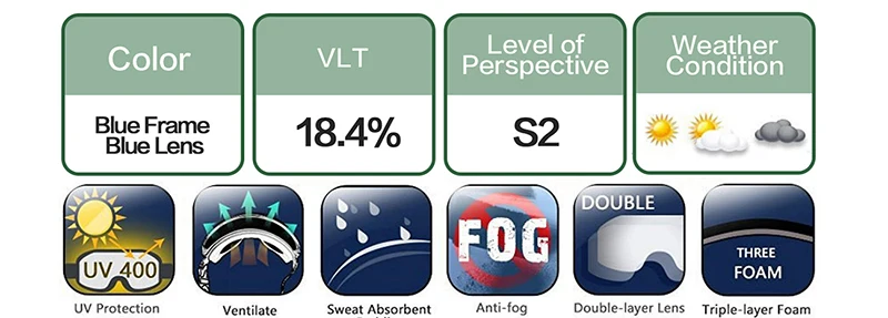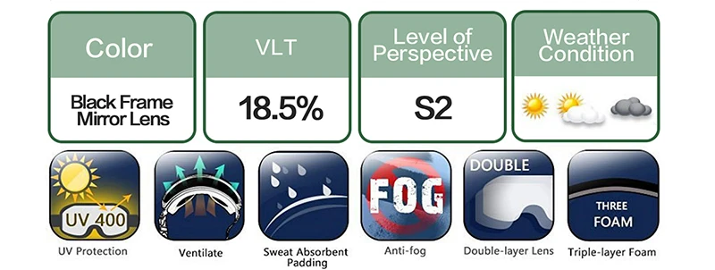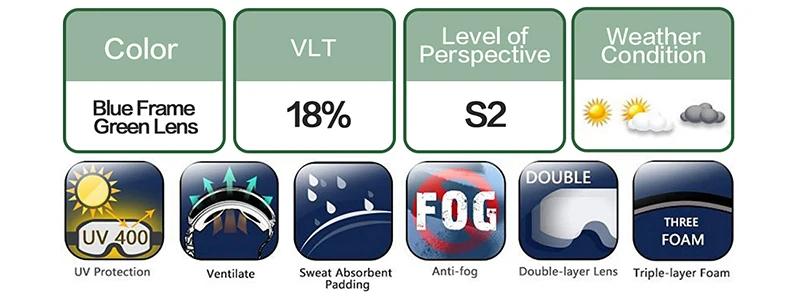 Технические характеристики:-Размер линз: 7,87 дюйма (Ш) x 3,97 дюйма (В)-Материал линз: поликарбонат + УФ-Материал оправы: ТПУ-Вентиляция: двусторонний канал-Размер лица: маленький и большой Описание продукцииVLT (видимый светильник) Справочная область:VLT 0-10%-для солнечных днейVLT 10-25%-для частично затуманиваемых солнечных днейVLT 25-60%-для пасмурных дней и сумерекVLT 60-90%-для ночных и сильно облачных дней Посылка включает в себя