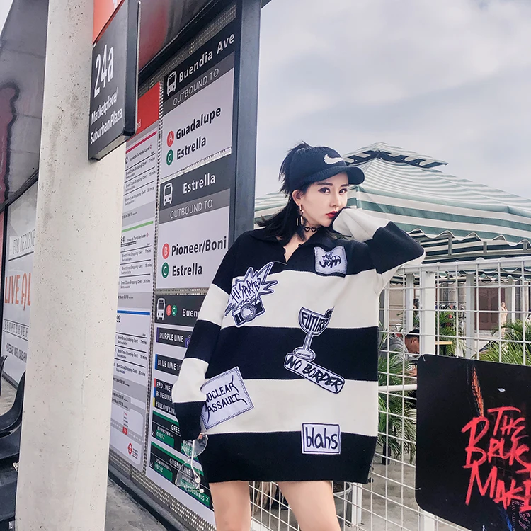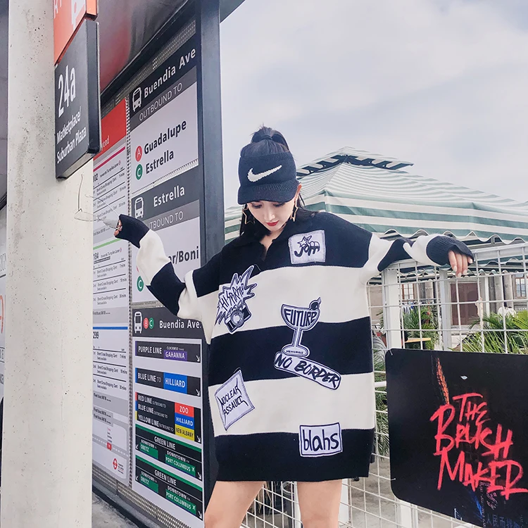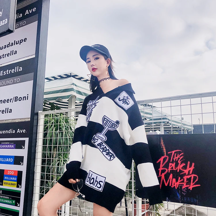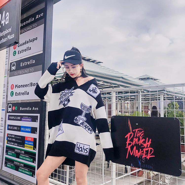 Vefadisa Women Letter Patchwork Sweater Black White Stripe Sweater Winter Warm Tops Long Sleeves Pullovere V-Neck Sweater ZLD259