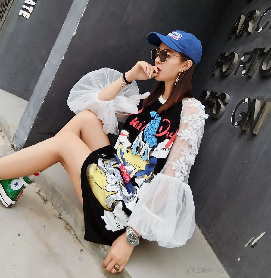 QING MO Летняя женская футболка с принтом героев мультфильмов, о-образный вырез, Свободный Прямой рукав «летучая мышь», кружево с блестками, Лоскутная женская футболка, юбка