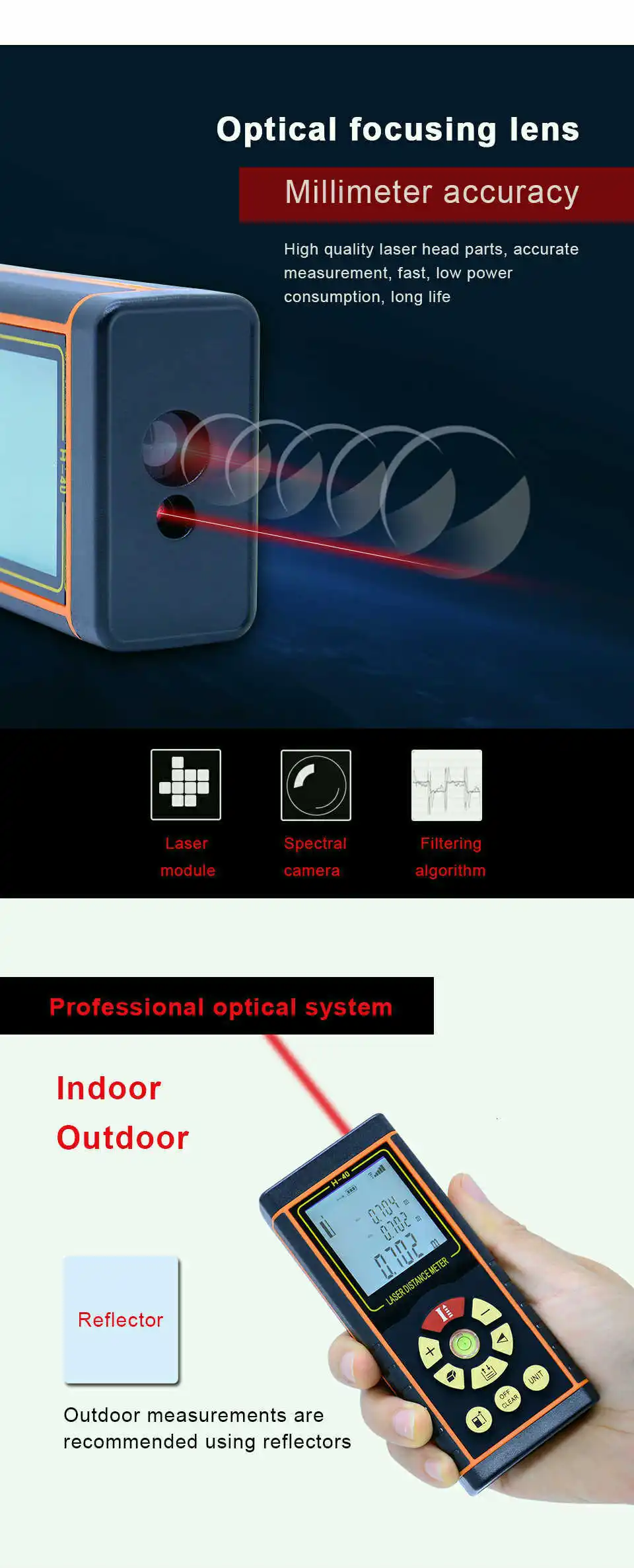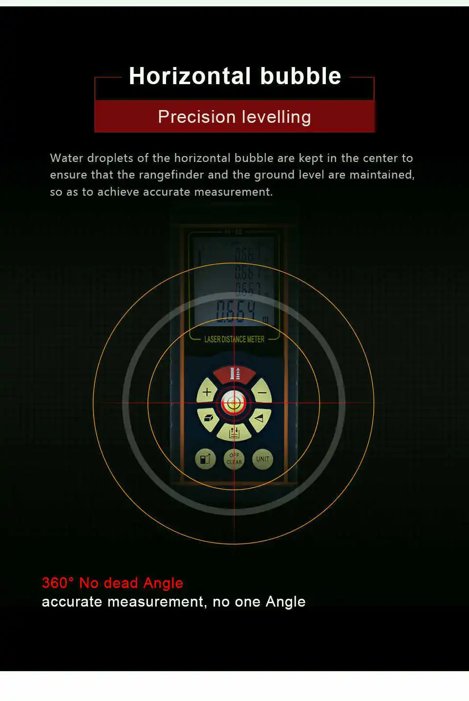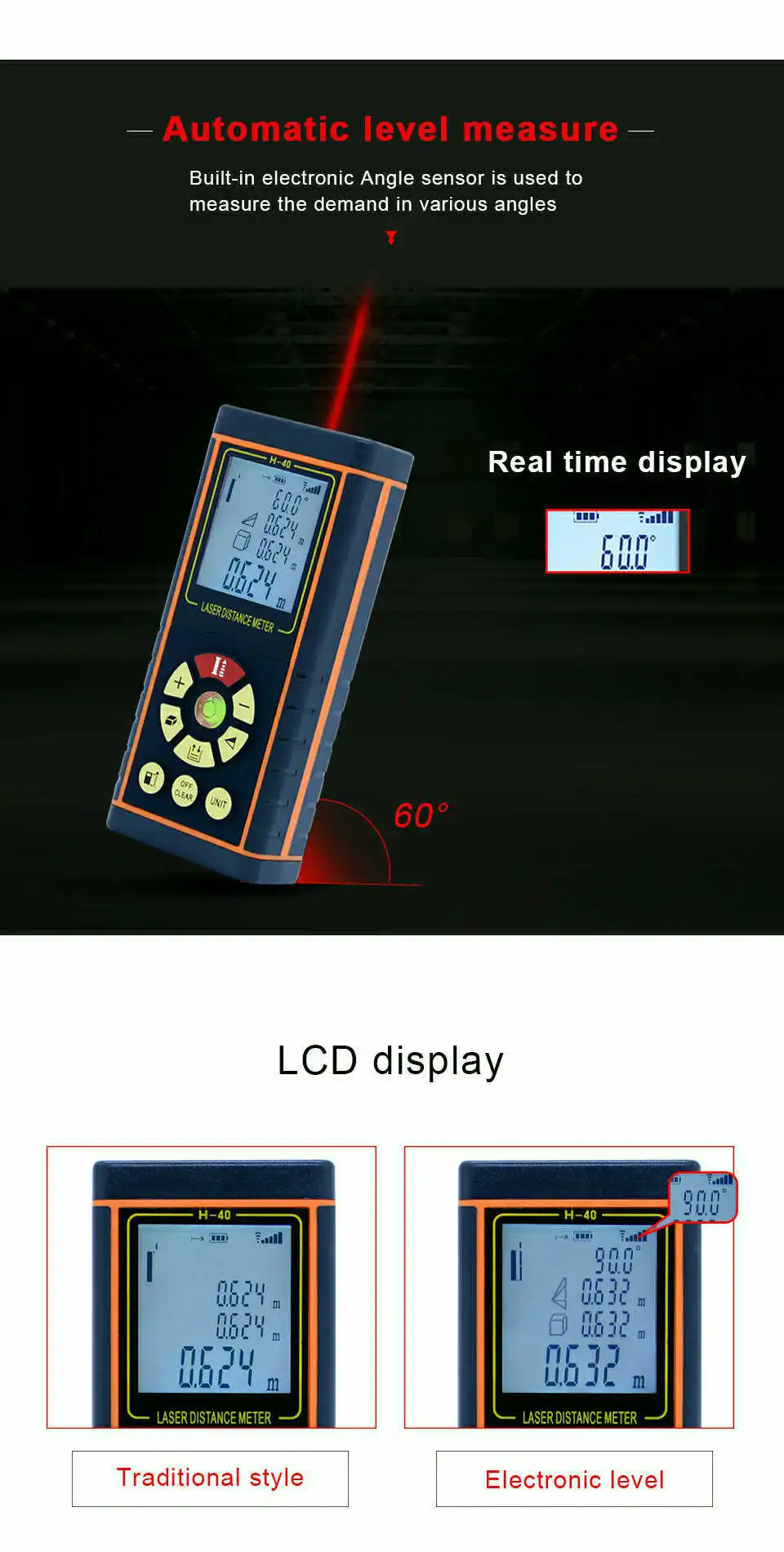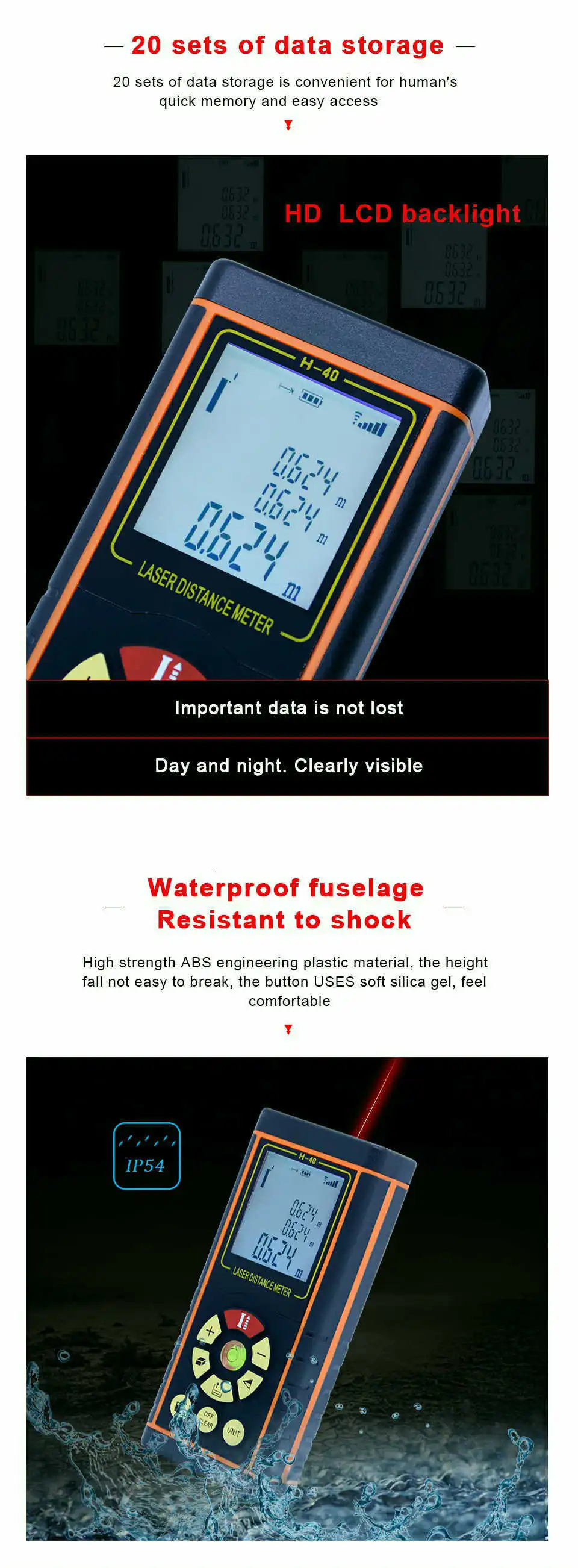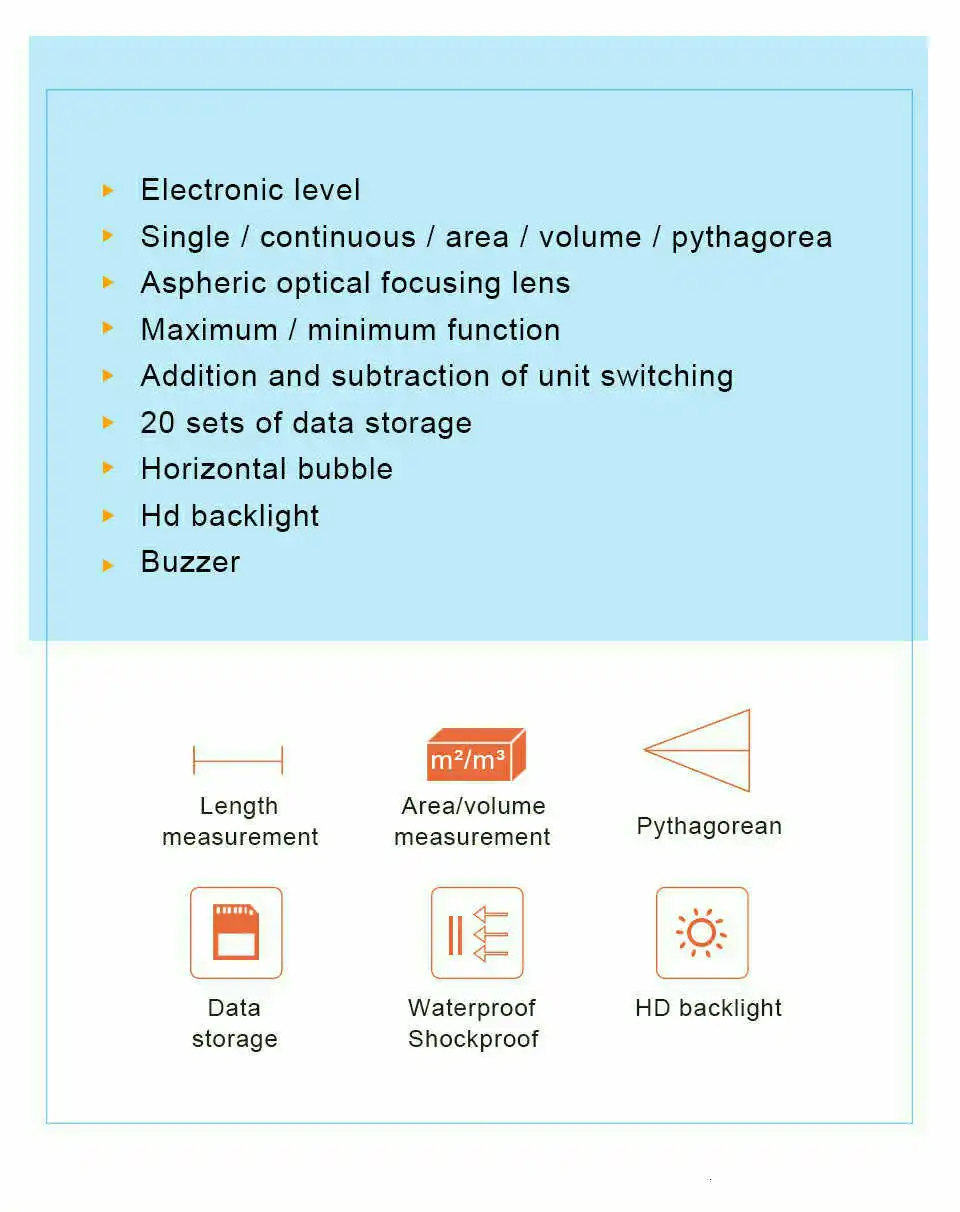 Особенности: 1. Может измерять расстояние, площадь и объем. 2. Широкий диапазон измерений. 3. Точность до ± 1,5 мм 4. Автоматический расчет площади и объема 5. Функция непрямого измерения по пифагору 6. Одиночное или непрерывное измерение 7. Максимальное и минимальное расстояние отслеживания на экране 8. Передний и задний бенчмаркинг 9. Поддерживает измерения в метрах, дюймах и ногах 10. Хранение и запоминание данных, хранение и очистка 11. Уровень пузырьков воздуха 12. Лазерная указка для легкого таргетирования 13. Большой ЖК-дисплей с подсветкой и 4 линиями текста 14. Автоматическая коррекция и отчет об ошибках 15. Устройство звуковой сигнализации индикатор 16. Индикатор состояния батареи 17. Защита IP54 (защита от пыли и брызг) 18. Автоматический или ручной Усилитель мощности 19. Измерение площади/объема/пифагорского сложения и subtractio 20. Длительность одиночного измерения: 0,1 ~ 4s Важные Технические характеристики: 1. Диапазон измерения: от 0,05 до 40, 60, 80 м и 100 м 2. Точность: ± 1,5 мм 3. Измерение Единица измерения: m/in/ft 4. Измерение Время: 0,1-4s 5 .. Класс лазера: класс II 6 .. Максимальная мощность лазера: <1 мВт 7. Защита от пыли и брызг: IP 54 8. Автоматическое отключение лазера: 60S 9. Автоматическое отключение питания: 480S Мин И Макс Измерение Соотношение цена/качество: √ Измерение ангела: и radic; Автоматический Уровень Измерение: и radic; 10. Рабочая температура: от 0 до 40 градусов C (от 32 до 104 F) 11. Температура хранения: от-20 до 60 градусов C (от 14 до 140 F 12. Мощность питания: 2x1,5 V элемент питания AAА (в комплект не входит) Упаковочный лист: 1 * самый дальний лазерный измеритель 1 * ремешок на руку 1 * Отражатель 1 * сумка 1 * Инструкция по эксплуатации