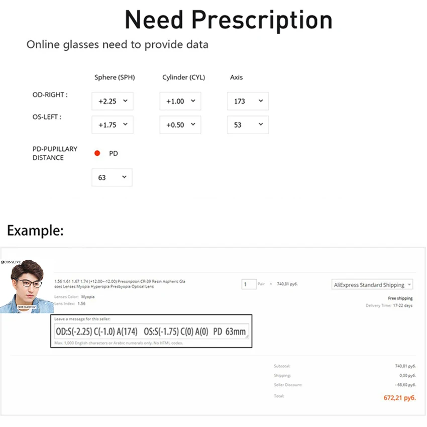 Пожалуйста, предоставьте нам свои данные по рецепту. Нам нужны ваши данные по рецепту для линз. Пожалуйста, оставьте сообщение в заказе: OD-R Sph xxx Cyl xxx Axis xxx OS-L Sph xxx Cyl xxx Axis xxx PD-R: ххх мм PD-L: ххх мм (Добавить: xxxx для прогрессивного) Мы сформируем и соберем линзы в выбранную вами рамку. При возникновении любых проблем, пожалуйста, свяжитесь со службой поддержки клиентов.