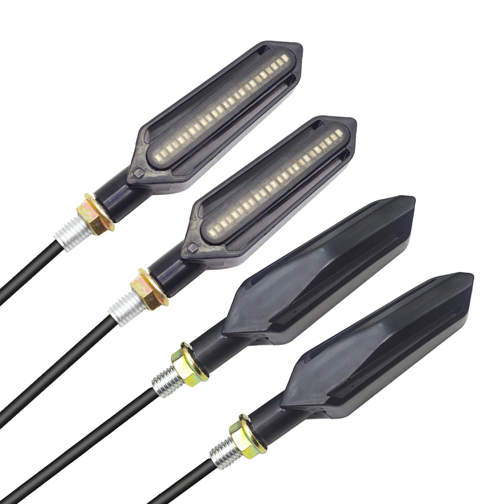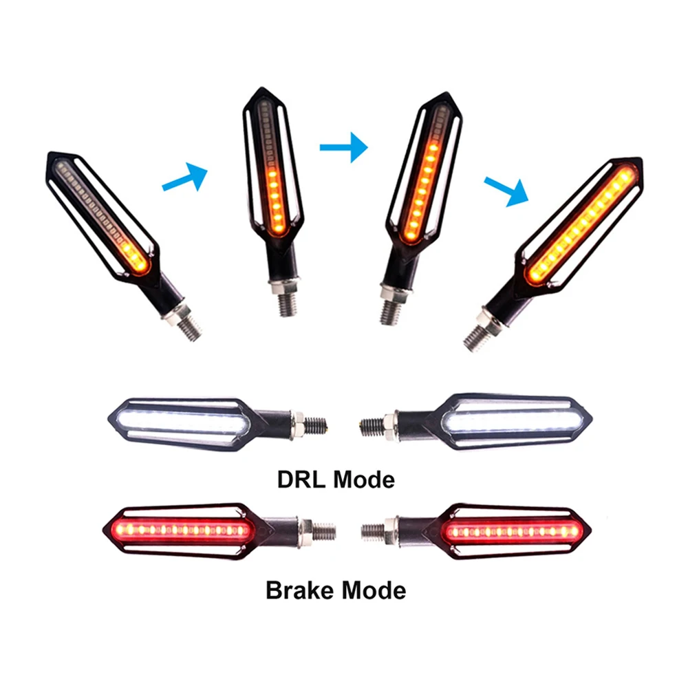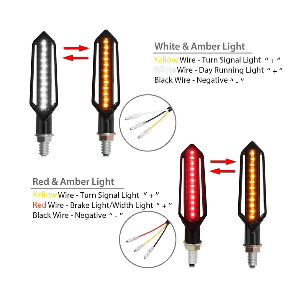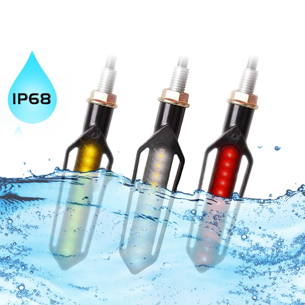 Универсальные Мерцающие светодиодные сигнальные огни для мотоцикла, индикаторы, мигалки для Kawasaki Honda Suzuki Yamaha KTM BMW ОсобенностиUesd для: сигнала поворота/индикаторовСветодиодный чип: высококачественный светодиодныйСветильник Тип: "бегущая вода" желтый светильник 3 вида цветовых огней и 2 режима работы: Режим DRL (Дневной светильник): белый светильник s + янтарный сигнальный светильник с поворотом (белый светильник s обычно используется спереди, до белого провода)Режим тормоза (стоп): мигающий красный светильник s (при замедлении/остановке) + янтарный сигнальный светильник. (Красные огни обычно используются в задней части, к красной проволоке) Проводка:Спереди: черный провод к отрицательному полюсу ( - ). Желтый провод (+) pastive pole/сигнал поворота. Белый провод: (+) полюс/АКК/ДХО/фара. Сзади: черный провод к ( - ) отрицательному полюсу. Желтый провод (+) pastive pole/сигнал поворота. Красный провод: (+) позиционный полюс/тормоз Материал: пластик + металлНапряжение: DC12vДлина провода: 20 смОтметка: никаких следов на этом товаре нет. Универсальный подходит для всех мотоциклов диаметром 10 мм (M10) монтажное отверстие.Модный вид, водонепроницаемый IP68