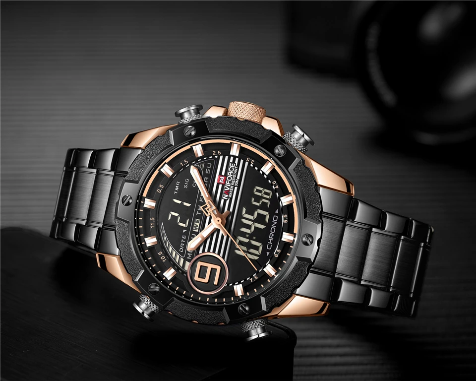 Описание 100% новые и высококачественные Будильник с 4 мин, Повтор Отображение дня, даты и времени Рождество каждый час Хронограф с круговым механизмом и 1/100 Двухъядерный Аналоговый и цифровой дисплей Функция EL (синий) Функция ежечасного звонка Кожаный ремешок Водонагреватель Технические характеристики Материал корпуса: нержавеющая сталь Диаметр корпуса: 46 мм Толщина корпуса: 16 мм Материал ремешка: нержавеющая сталь Длина ремешка (включая корпус): 260 мм Ширина ремешка: 24 мм Вес: 101 г Что входит в комплект 100% новый бренд NAVIFORCE 1 x аналоговый и цифровой дисплей с будильником и EL Blue Function Watch