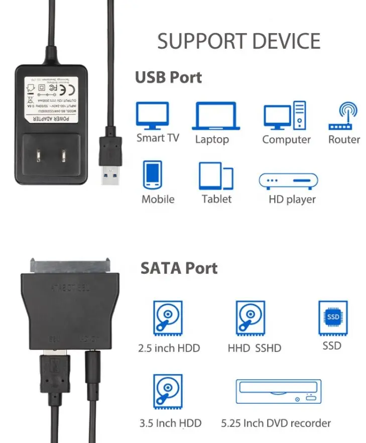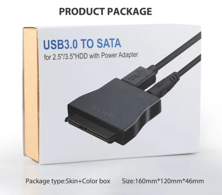 Название продукта: USB 3,0 SATA адаптер конвертер, украшенное мозаикой из драгоценных камней, 12V Мощность для 2,5 3,5 дюйма Жесткий диск SSD Цвет черный Материал ABS корпус Кабель USB 3,0 A папа-Папа, Длина: 60 см (24 + 32AWG, диаметр = 4,2 мм Мощность адаптер OD: 3,5 мм, Длина: 125 см Упаковочная коробка Вес изделия 218 г Проверка качества электрического теста и визуальный осмотр Гарантия один год Посылка: 1 × адаптер USB 3,0 для SATA 1 × Кабель USB 3,0 60 см 1 × адаптер питания для ЕС или США 125 см 1 × руководство пользователя Функция продукта 1. Подключите блок к любой 3,5 "или 2,5" SATA жёсткий диск или твердотельный накопитель к вашему компьютеру для высокоскоростную передачу данных. 2. Быстро и легко создавать резервную копию, перемещать или хранить ваши файлы ноутбука или жесткого диска ПК. Ключевые особенности Быстрая скорость передачи данных с UASP-адаптер поддерживает скорость передачи данных USB 3,0 5 Гбит/с, И вы можете испытать скорость передачи до 70% быстрее, чем обычный USB 3,0 при подключении к компьютеру, который также поддерживает UASP