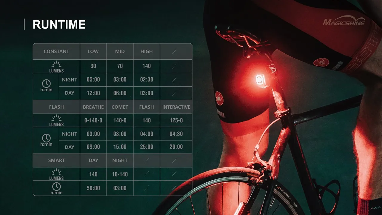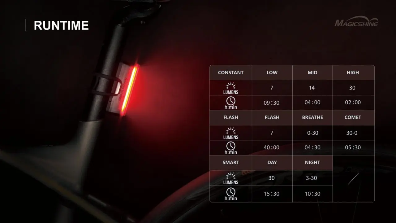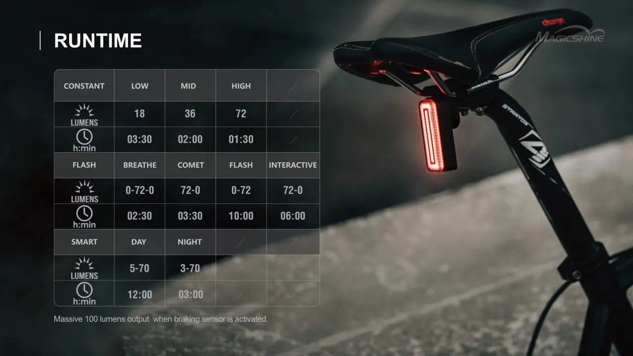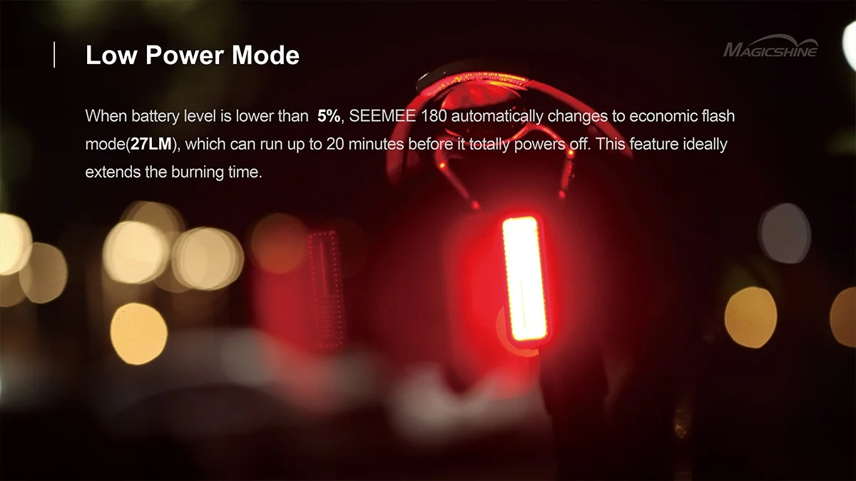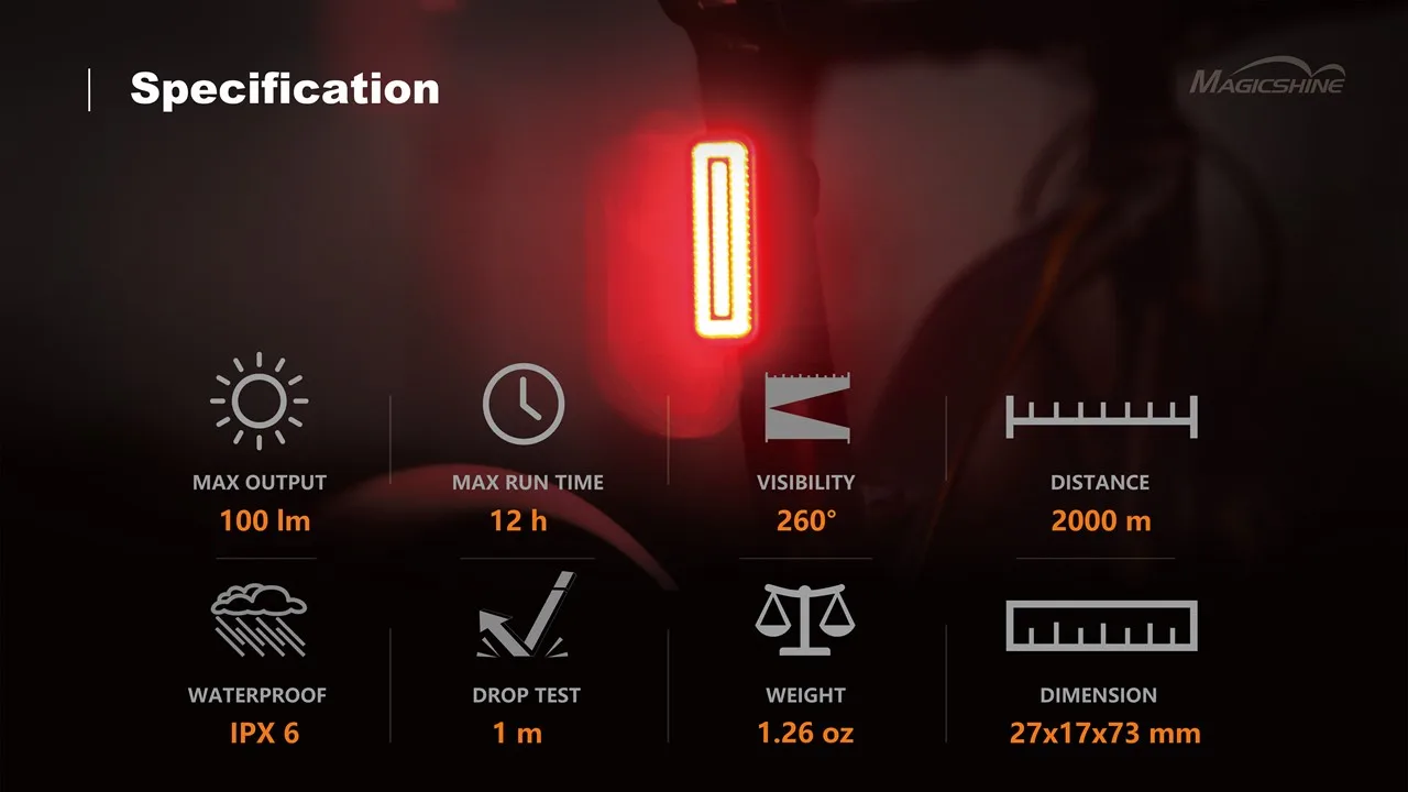Magicshine Seemee 100 велосипед хвост светильник Новый член в серии Magicshine Seemee велосипедные задние фонари. Seemee 100-это мощный задний светильник безопасности для дорожных, городских и горных байкеров, с широкой видимостью, датчиком тормоза и режимом низкой мощности 100 люмен, 72 Вт Световой поток, 260 градусов обзор, видно из более чем 1,5 миль Датчик тормоза: светильник 100 люмен на тормозе и длится 3 секунды Датчик окружающего светильник: автоматический регулирует режим и выход светильник в зависимости от условий окружающей среды Режим низкой мощности: энергосберегающий режим вспышки срабатывает при 5% батарее и длится 20 мин Постоянный и 4 режима вспышки, 3 режима яркости 1,5 часов время работы на самой высокой яркости Постоянный режим Вес 36 г Перезаряжаемый USB Уплотнительное кольцо