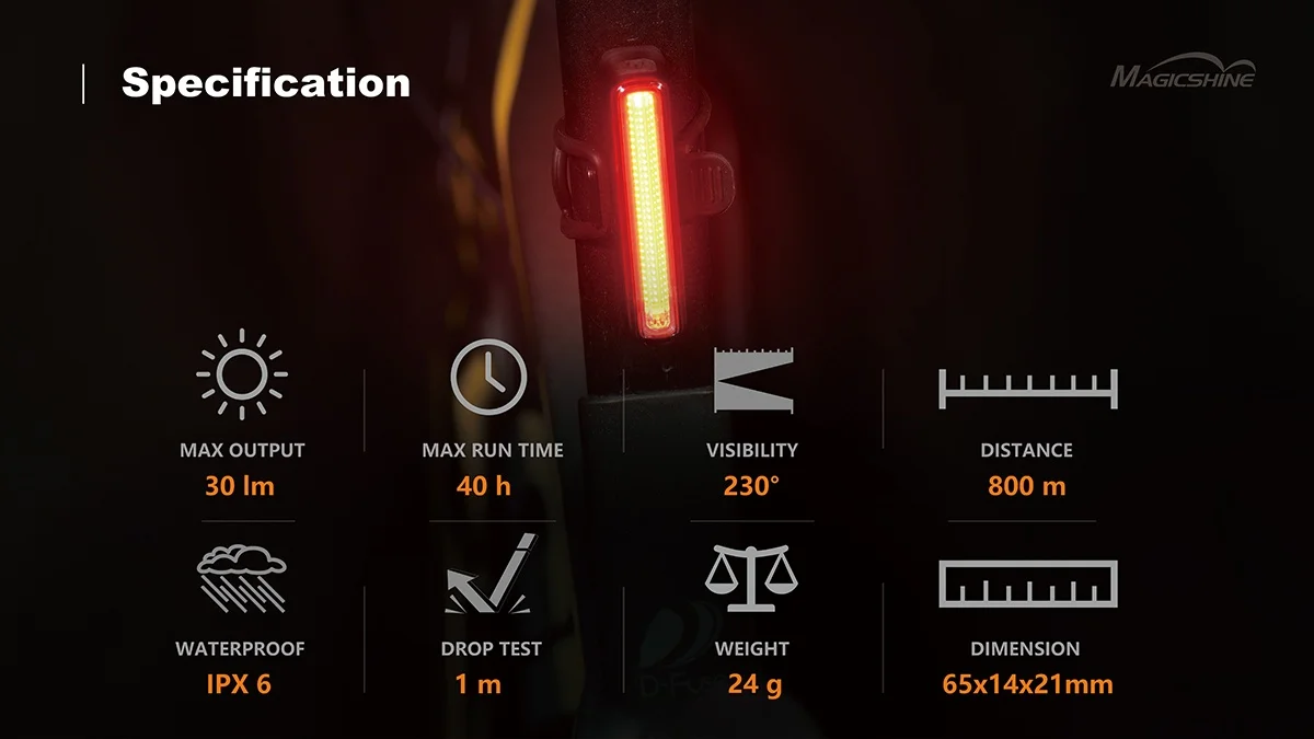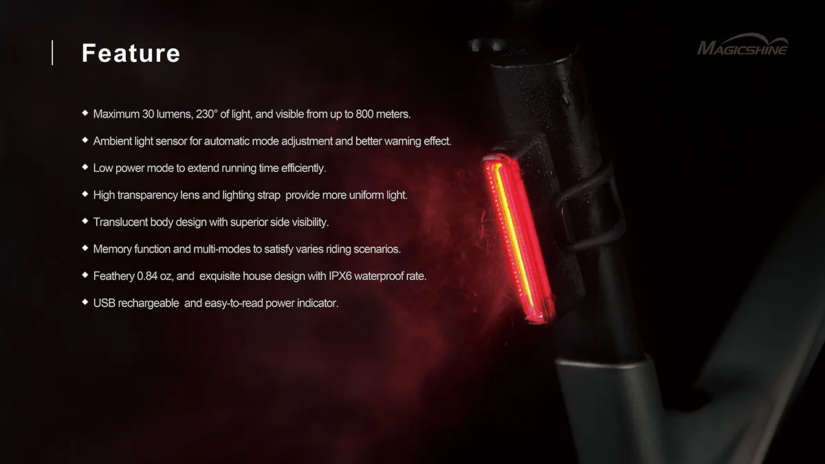 Magicshine Seemee 30TL велосипед хвост светильник Magicshine Новый велосипедный задний светильник, Seemee 30, поставляется в переднем/заднем комбинированном комплекте или автономный задний светильник. Небольшой, вес светильник и очень широкий угол видимости. 30 люменов Макс, видимость 230 градусов Датчик окружающего светильник: автоматический регулирует режим и выход светильник в зависимости от условий окружающей среды Режим низкого заряда батареи: энергосберегающий режим вспышки срабатывает при 5% батарее и длится 20 мин 1 постоянный и 4 режима вспышки, 3 режима яркости 2 часа работы в режиме максимальной яркости Вес 24 г Перезаряжаемый USB Уплотнительное кольцо