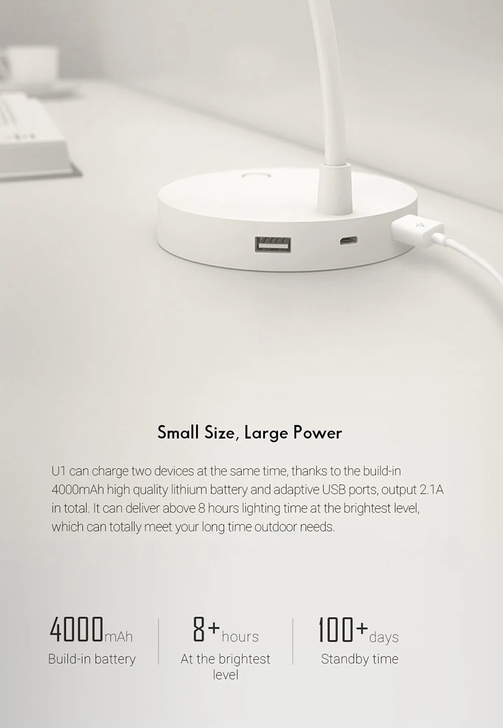 ● Мобильное освещение, источник питания для мобильного телефона, U1 имеет аккумулятор большой емкости высокого качества, база имеет два адаптивных порта USB выхода, может легко заряжать мобильное устройство.