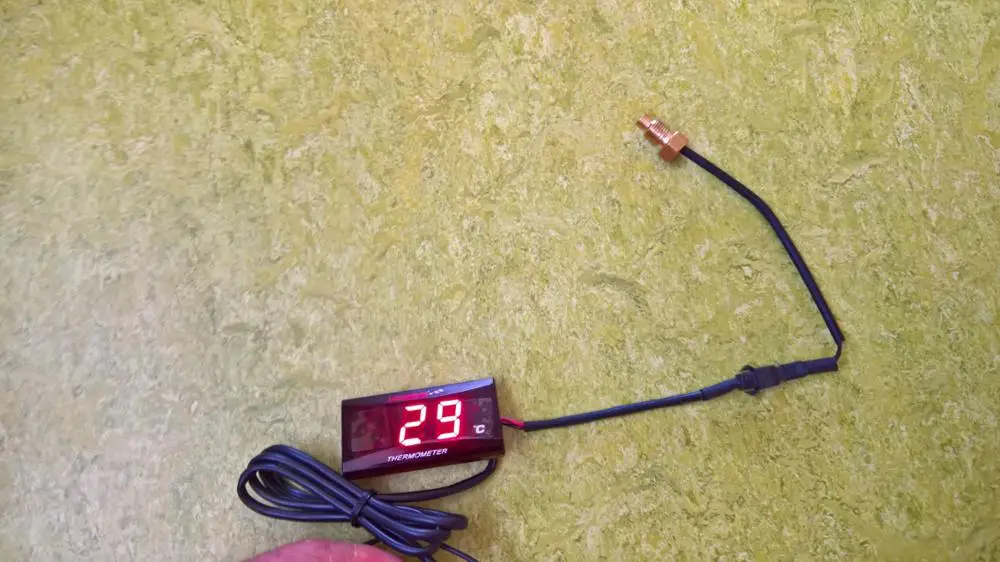 Адаптер встроен в выходной шланг радиатора и винты датчика на стороне, чтобы прочитать температуру воды.